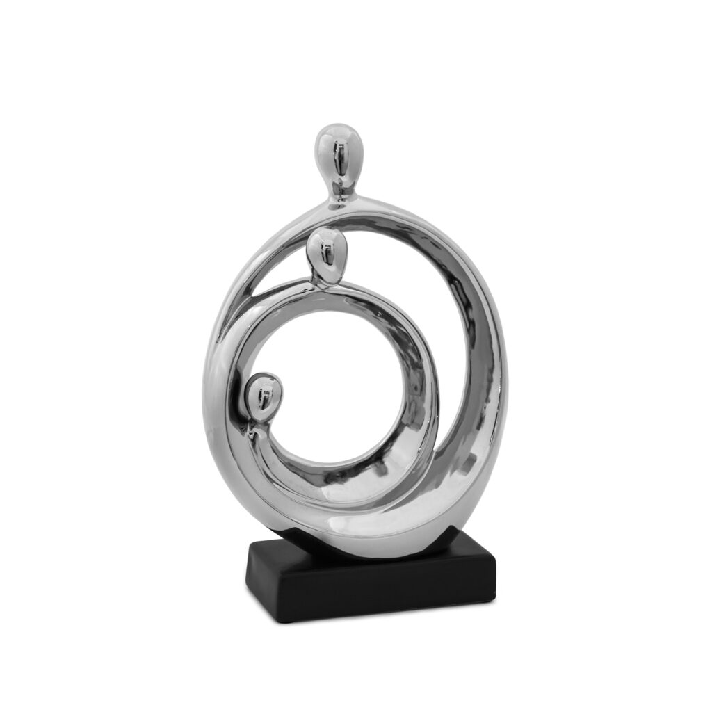 [0] => The Family Circle Statue features an abstract depiction of a loving embrace, with arms and bodies flowing together into a single circle. This piece is made from ceramic and finished in an electroplated nickel that creates a mirrored effect. The simple padded black base ensures you can place this statue on any surface to bring a sense of unity and balance to your space.