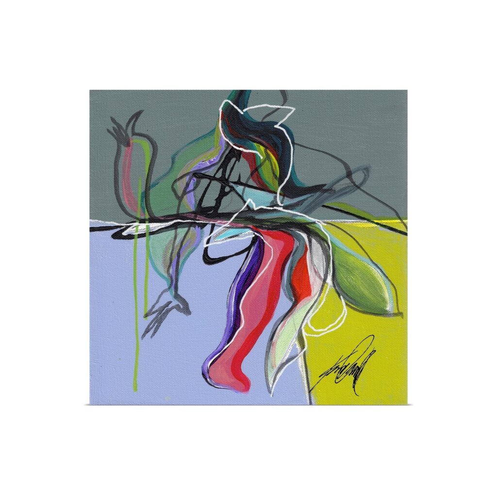 [0] => Figure Study 6 is an edgy contemporary artwork full of dynamic lines and contrasting hues. A color-block background of grey, blue, and yellow is overlaid with black and white outlines that evoke figures in motion. Accents of red, yellow, green, and blue add dimension to the figures, while a glossy finish creates a sleek and shiny impression.