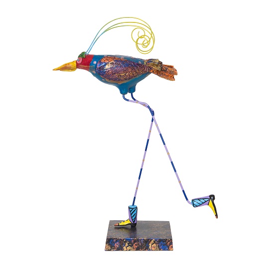 [0] => The Flight of Fancy Bird, by artist Steven McGovney, has a fun and quirky personality, with a multicolored body, bright plume, patterned boots, and a dynamic pose. Flight of Fancy is made of hand-built high-fire ceramic with acrylic, metallic, and oil stain finishes. Place it on your bookshelf, table, or credenza to instantly add charm to any room.