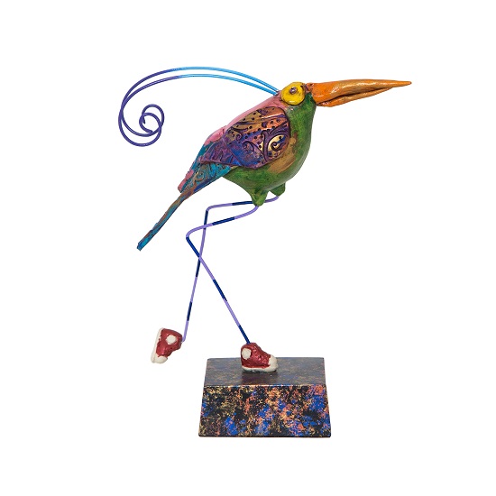 [0] => The Flight of Fancy Bird, by artist Steven McGovney, has a fun and quirky personality, with a multicolored body, bright plume, colorful sneakers, and a dynamic pose. Flight of Fancy is made of hand-built high-fire ceramic with acrylic, metallic, and oil stain finishes. Place it on your bookshelf, table, or credenza to instantly add charm to any room.