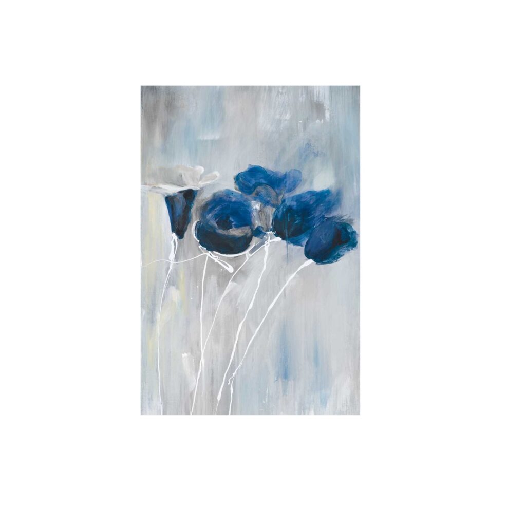 [0] => The Flora Chic Wall Art has a soft, whimsical design with relaxed brushstrokes forming deep blue roses. The muted background contrasts with the mixture of cool cool-toned colors, intermingling to create a rainy, misty scene. A simple piece meant to soothe the soul.