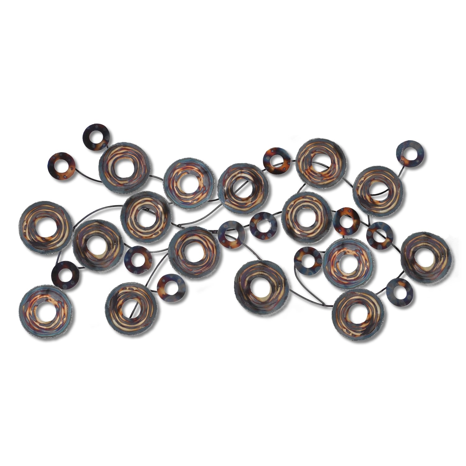 The Flourish Wall Art features an array of metal circles connected by a slim metal wire. The heat-treated steel brings out iridescent colors in the metal, making each piece uniquely patterned. Flourish will add a contemporary, dynamic edge to your living or office space.