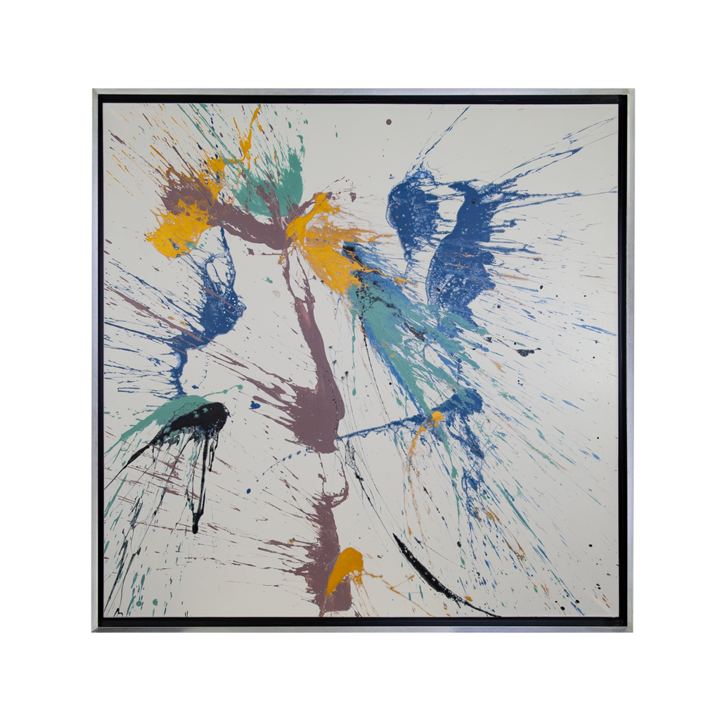 [0] => The Fluids Pastel Wall Art is fun and invigorating, with a smattering of paint splatters in deep pastel tones that inspire creativity. Housed in a black and silver fame, this painting also features black and mustard accents that add depth and highlight the underlying tones of the other colors.