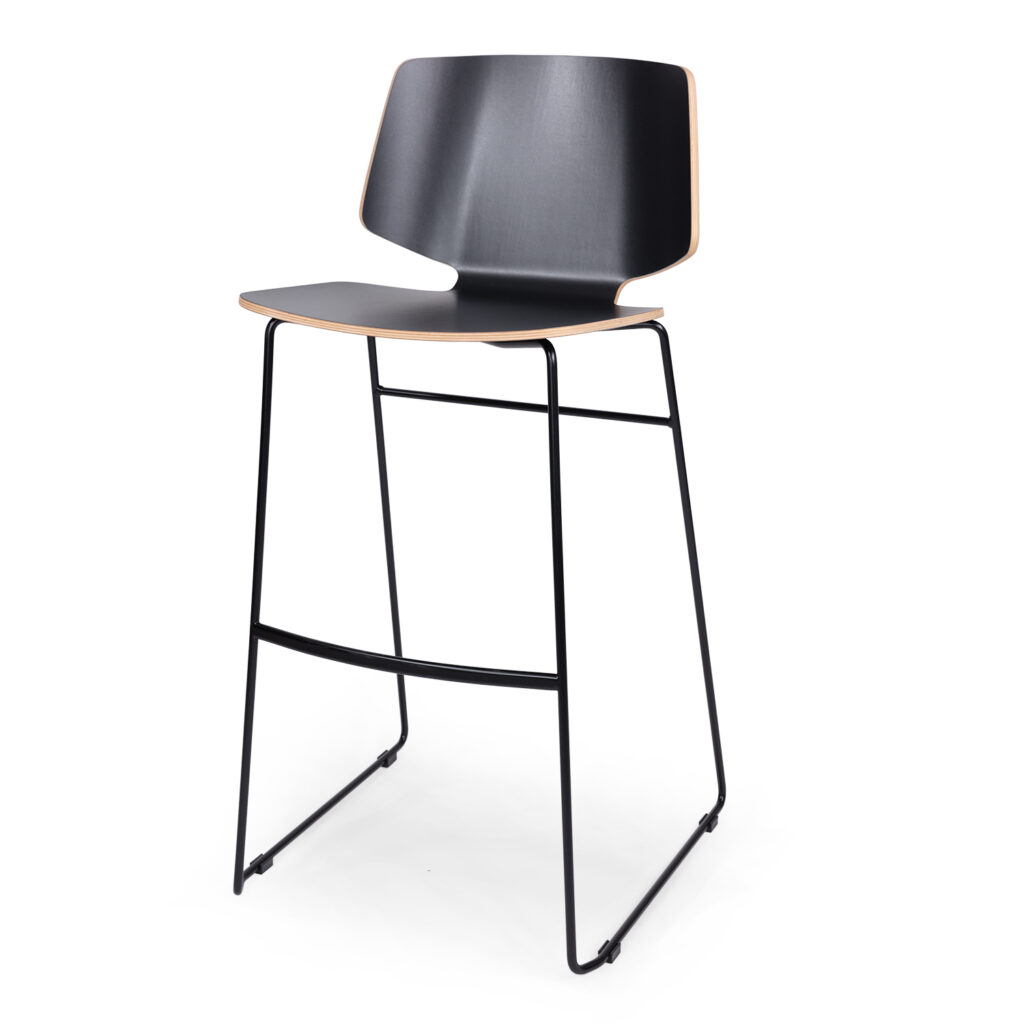 The Fly Barstool is chic and minimalist, with a sleek black frame and curved seat. The edges of the seat show the exposed wood laminate for a sophisticated, contrasting look, and the gently flared arms of the seat back add both support and style. With its clean design and minimalist palette, the Fly Barstool can integrate well into any design environment.