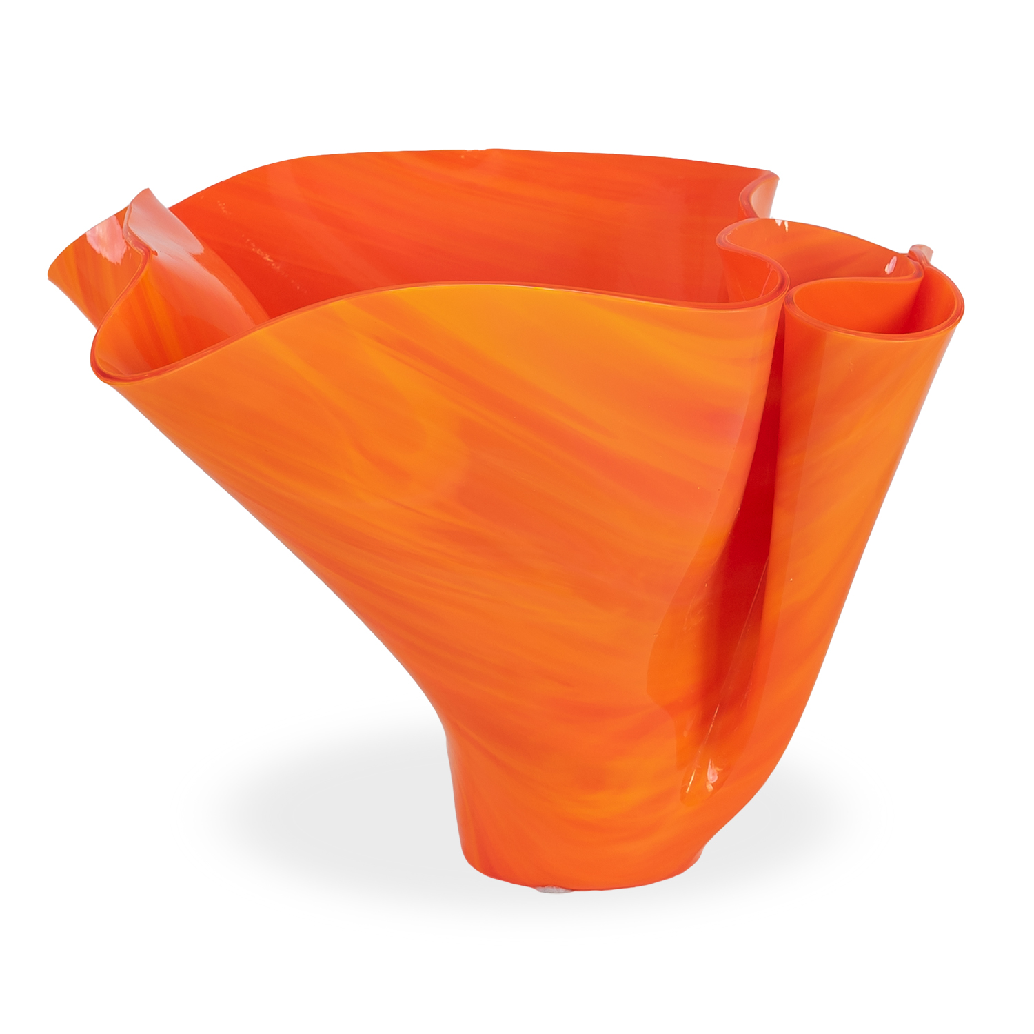 [0] => The Folded Glass Vase features an energizing shade of orange accented with flowing white striations. Designed by Arizona glass artisans Carole Perry and Don Carroll, each Folded Glass Vase is shaped with eye-catching curves and folds that evoke organic forms and imbue the piece with a feeling of motion. Display the Folded Glass Vase on its own or pair it with other colors in the same collection to create a stunning rainbow across your dining table or sideboard.