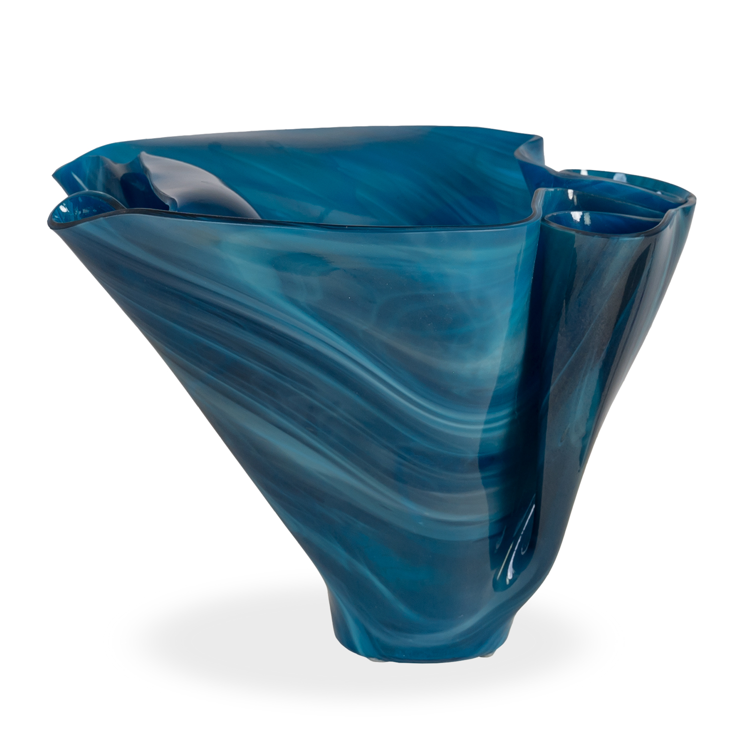 [0] => folded glass vase teal/white swirl 8" x 7" h