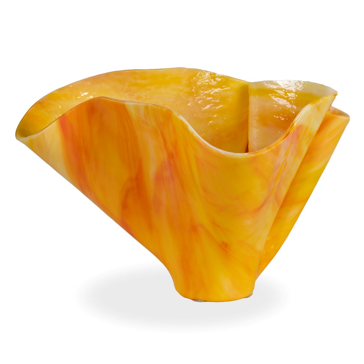 [0] => folded glass vase yellow/orange/white swirl 8" x 7" h