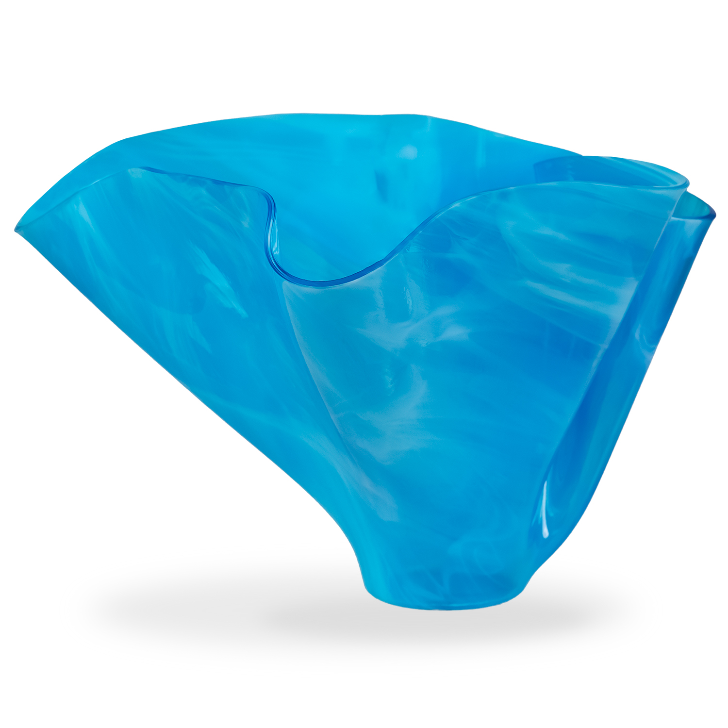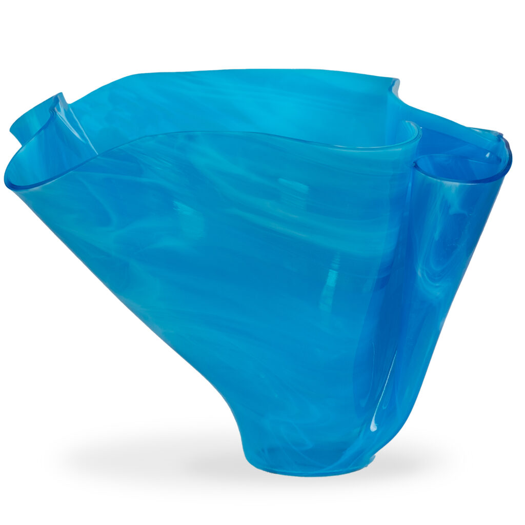 The Folded Glass Vase features a rich shade of turquoise and a one-of-a-kind silhouette. Designed by Arizona glass artisans Carole Perry and Don Carroll, each Folded Glass Vase is shaped with eye-catching curves and folds that evoke organic forms and imbue the piece with a feeling of motion. Display the Folded Glass Vase on its own or pair it with other colors in the same collection to create a stunning rainbow across your dining table or sideboard.