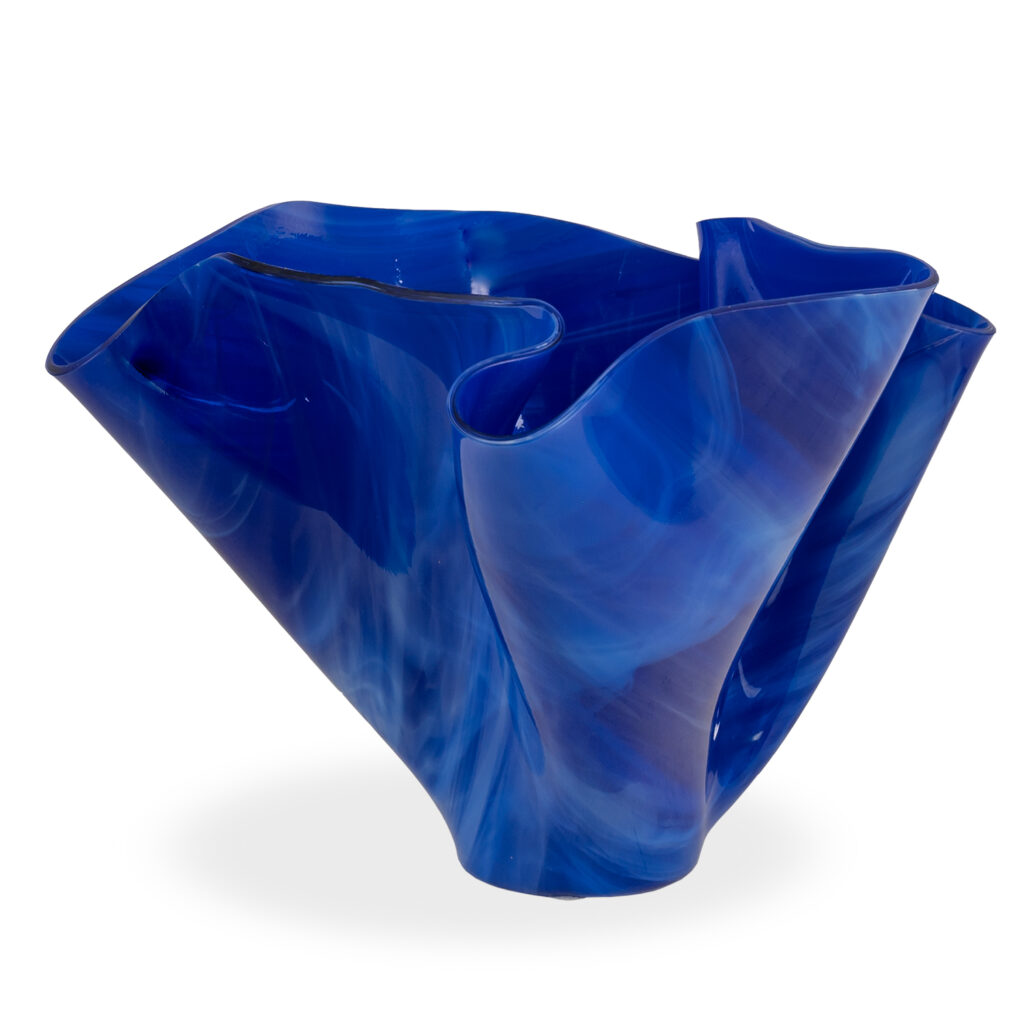 [0] => folded glass vase royal blue/white swirl 8" x 7" h