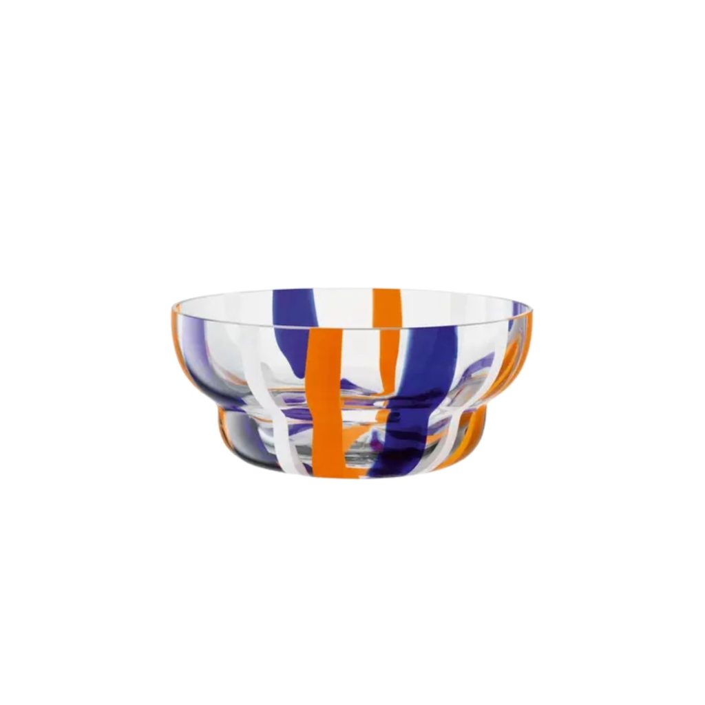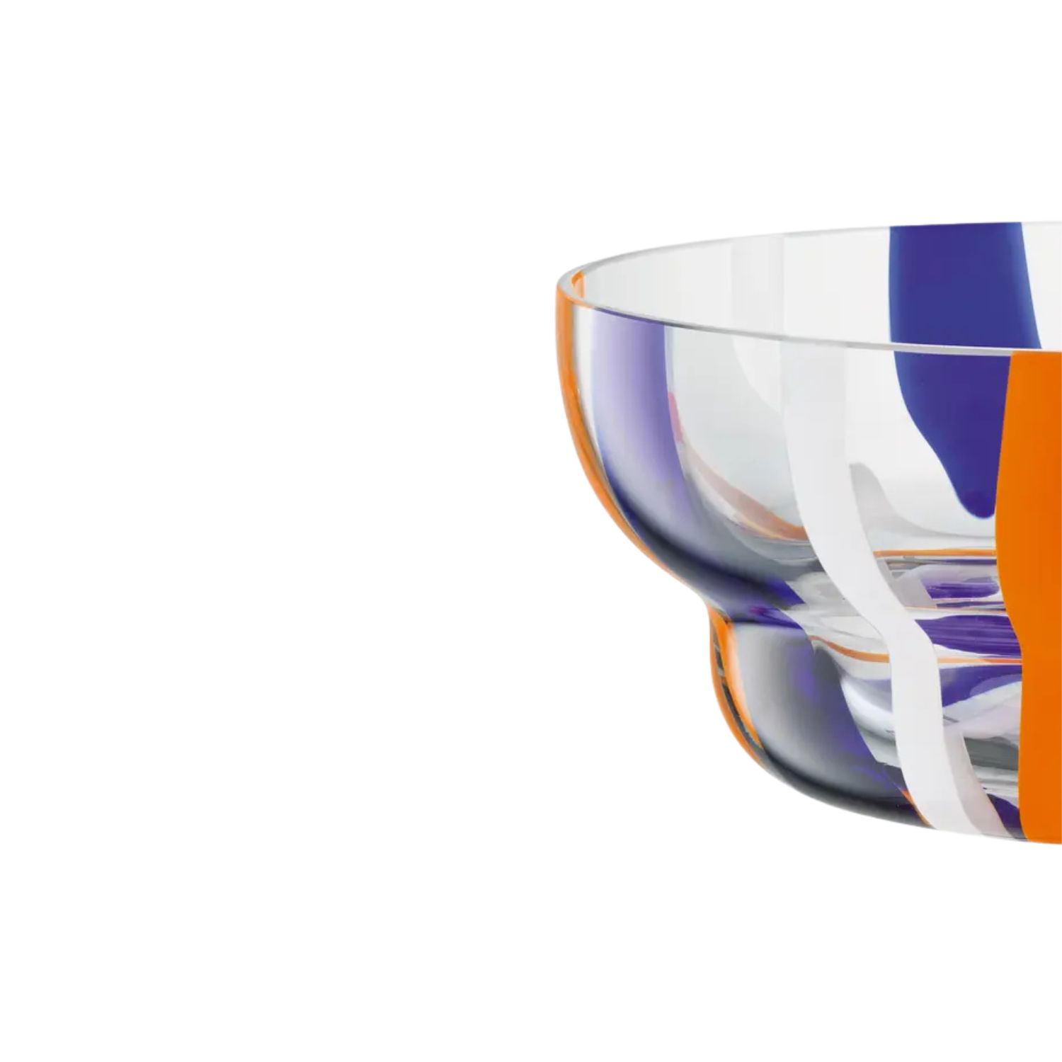 Inspired by traditional Polish costume, the Folk Bowl adds a vibrant and cheerful accent to any dining table. This bowl's striped design in blue, orange, and white is an homage to Polish Lowicki fabrics, while the curving shape was made to evoke the look of layered skirts. Crafted from mouth-blown glass, the Folk Bowl is a playful container for salads, sides, fruit, and other dishes.