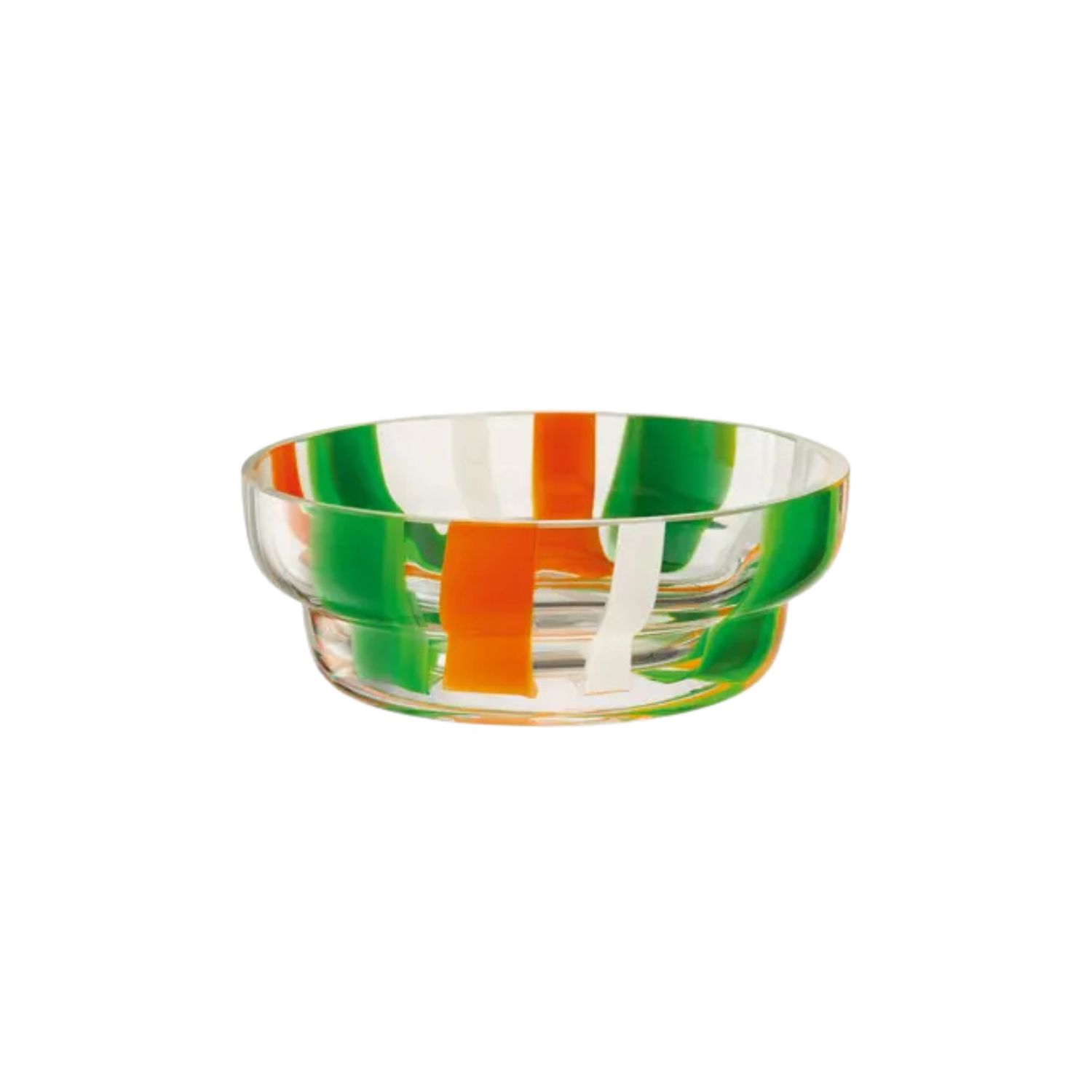 Inspired by traditional Polish costume, the Folk Bowl adds a vibrant and cheerful accent to any dining table. This bowl's striped design in orange, green, and white is an homage to Polish Lowicki fabrics, while the curving shape was made to evoke the look of layered skirts. Crafted from mouth-blown glass, the Folk Bowl's compact size makes it a playful container for snacks, sides, and other small dishes.