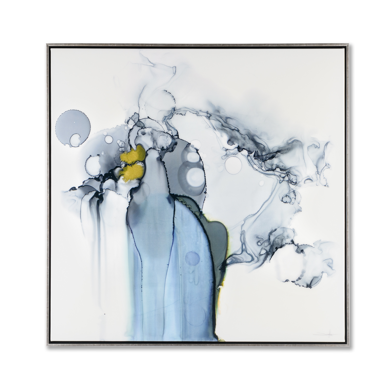 The Forces Wall Art features subtle pastel colors such as blue and grey with a few pops of yellow. These muted colors create a flowing texture, reminiscent of the natural movement of water or vapor. The golden yellow keeps this piece from becoming too melancholy by adding a touch of sunlight.