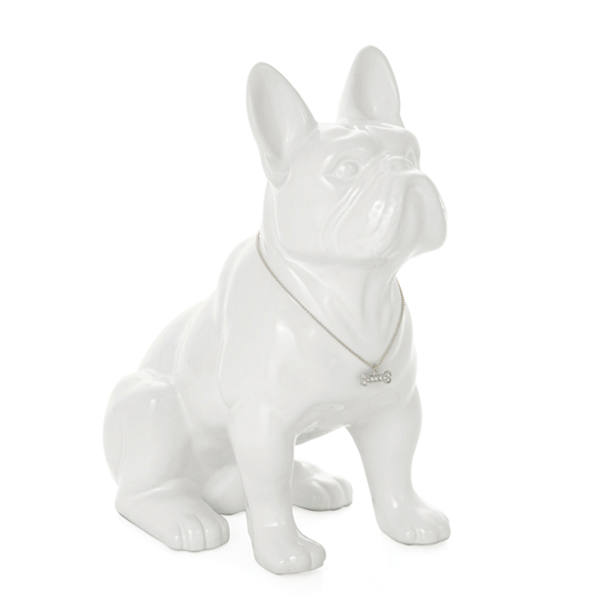 The French Bulldog statue, available in white, features a depiction of a sitting French bulldog made from ceramic. The dog's pose is relaxed but attentive, and he wears a silver necklace in the shape of a bone, which is part of the statue and included with purchase. Place the French Bulldog on a credenza, table, or elsewhere in a room to add chic, adorable style.