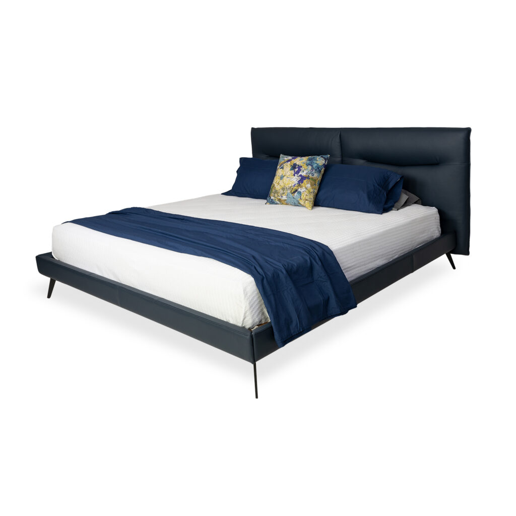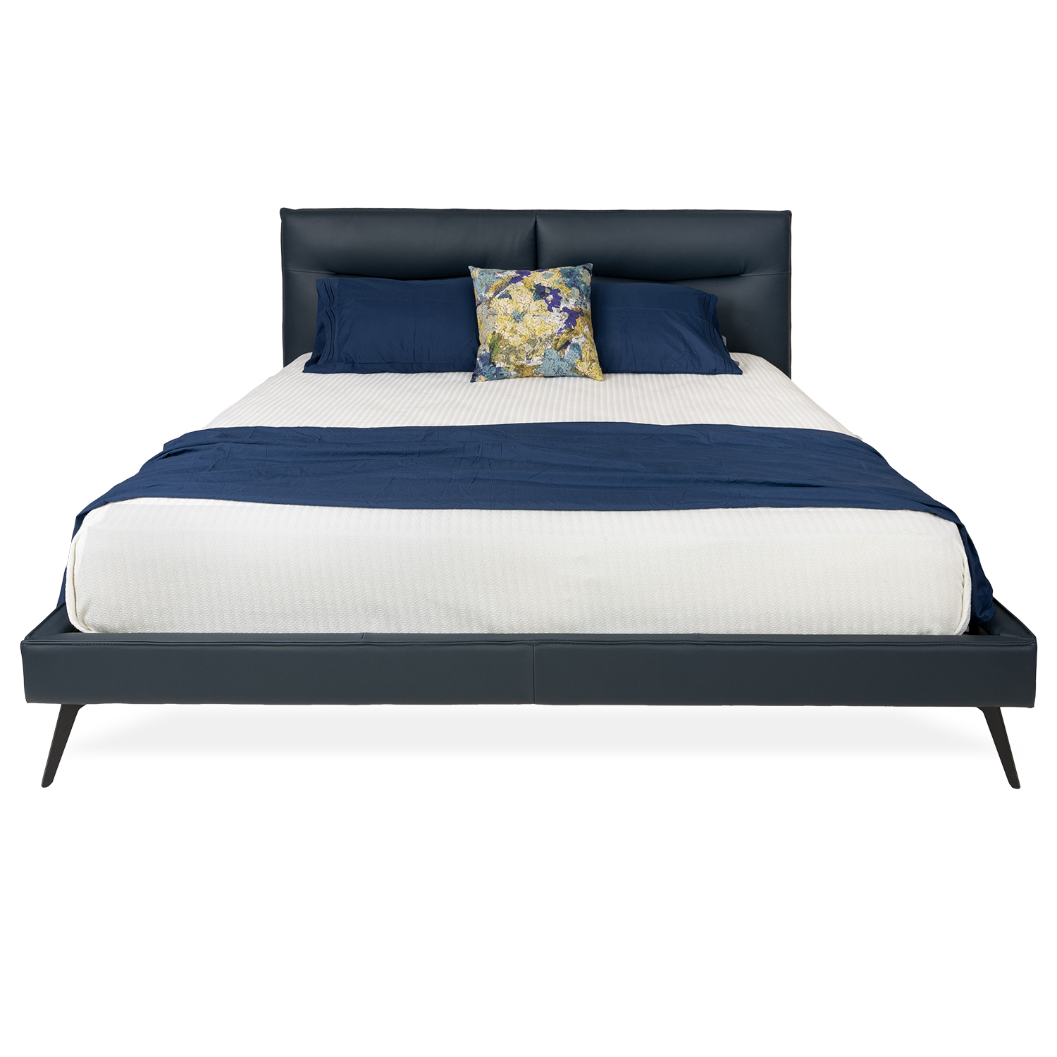 [0] => Designed in Italy, the Fresi King Bed will infuse any bedroom with an atmosphere of luxury and comfort. Upholstered in gorgeous dark blue Giotto leather, Fresi features a padded headboard with envelope-like accent stitching, ideal for leaning against as you read, watch TV, or simply relax in bed. The upholstery is finished with inverted seams on both the headboard and the lower frame for a coordinated look, while slim angled legs made of matte black metal add a mod touch.