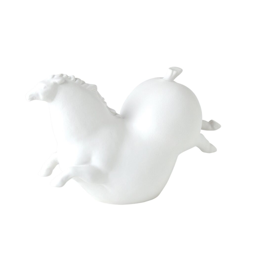 Made of Portuguese ceramic with a matte white finish, the Friesian Horse sculpture rests on its belly in a pose that suggests it is in the midst of jumping. With a rotund form and miniaturized head and limbs, the Friesian Horse is a quirky and fanciful piece sure to elicit smiles and conversation among guests in your home or office.
