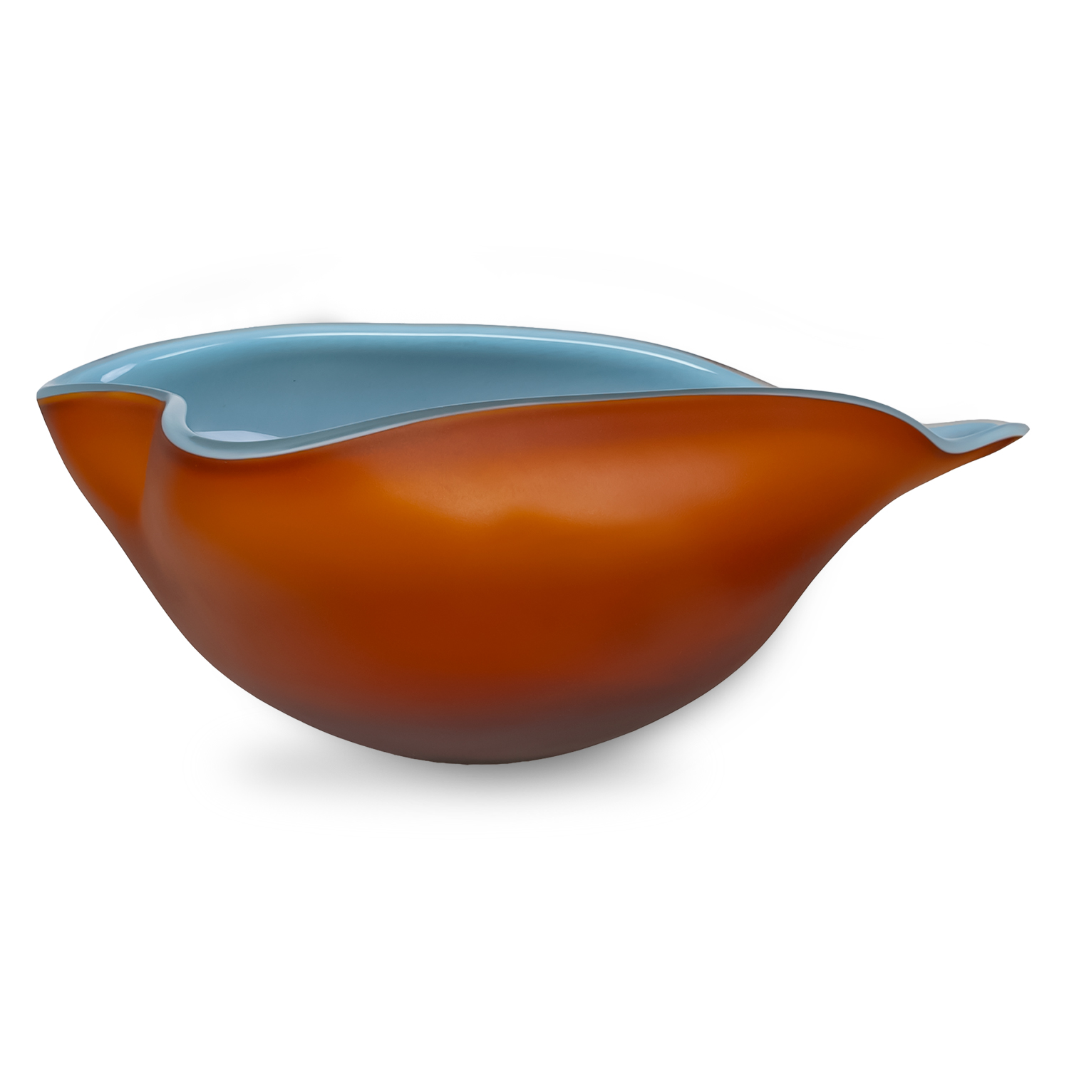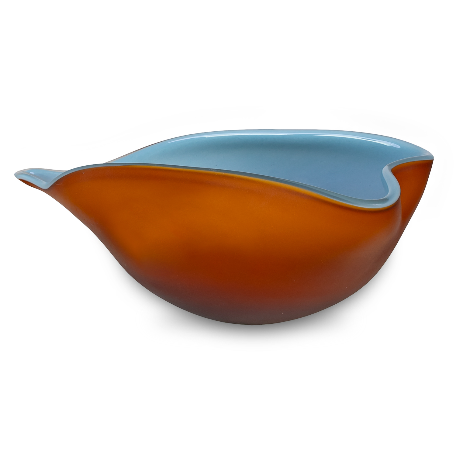 The Frosted Amber Bowl features a uniquely organic, leaf-like silhouette with a matte amber exterior and a glossy light blue interior. Made of caned glass, each bowl is hand-shaped in a still-molten state to form a soft divot and a narrow tip on opposite sides of its rim. Watertight glaze ensures you can display both fresh and artificial flowers in this striking bowl.