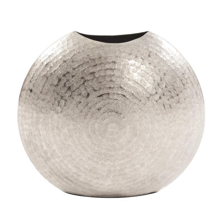 The Frosted Silver vase features a rounded, disk shaped body with a metallic silver finish. The silver has been hammered into a circular pattern that creates the delicate and pretty frosted finish.