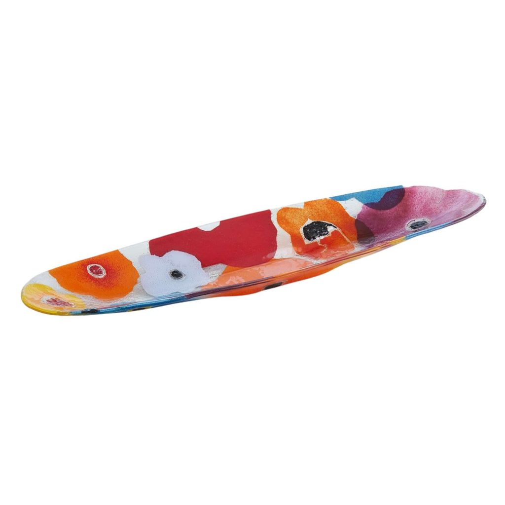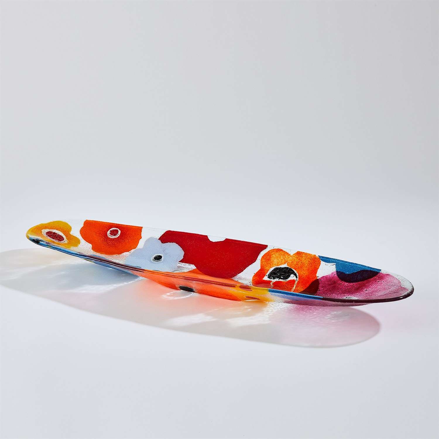 Handcrafted by Portuguese artisans, the Fused Floral Boat Bowl has an exquisite, joyful design that will add a burst of color to any dining space. The intricate spring floral design is created from layers of colored sand and clear glass shapes fused together in a kiln. This bowl is food safe, watertight, and features a long, elegant structure that makes it as functional as it is beautiful.