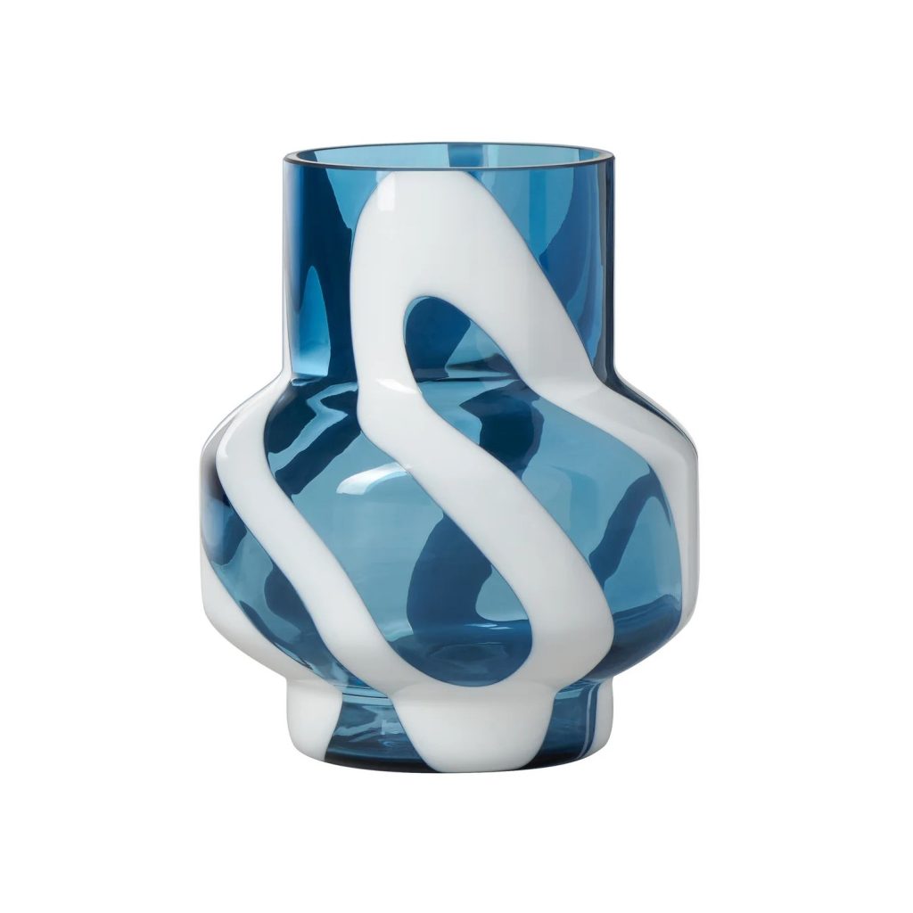 [0] => The Fusion Abstract Short Vase is made of transparent blue glass with an opaque white swirled design. This vase's modern shape features a wider bottom half that tapers into a narrower neck and base. Elegant yet funky, the Fusion Abstract Vase is equally at home standing on its own or paired with your favorite flowers.