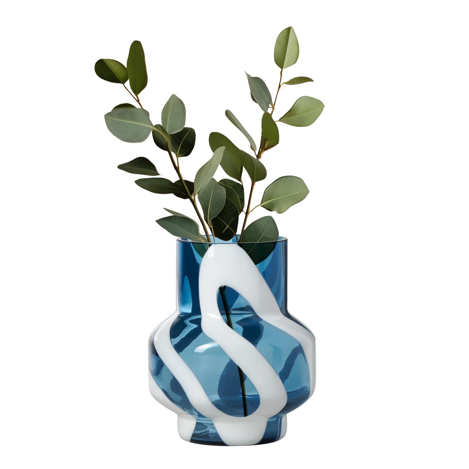 The Fusion Abstract Short Vase is made of transparent blue glass with an opaque white swirled design. This vase's modern shape features a wider bottom half that tapers into a narrower neck and base. Elegant yet funky, the Fusion Abstract Vase is equally at home standing on its own or paired with your favorite flowers.