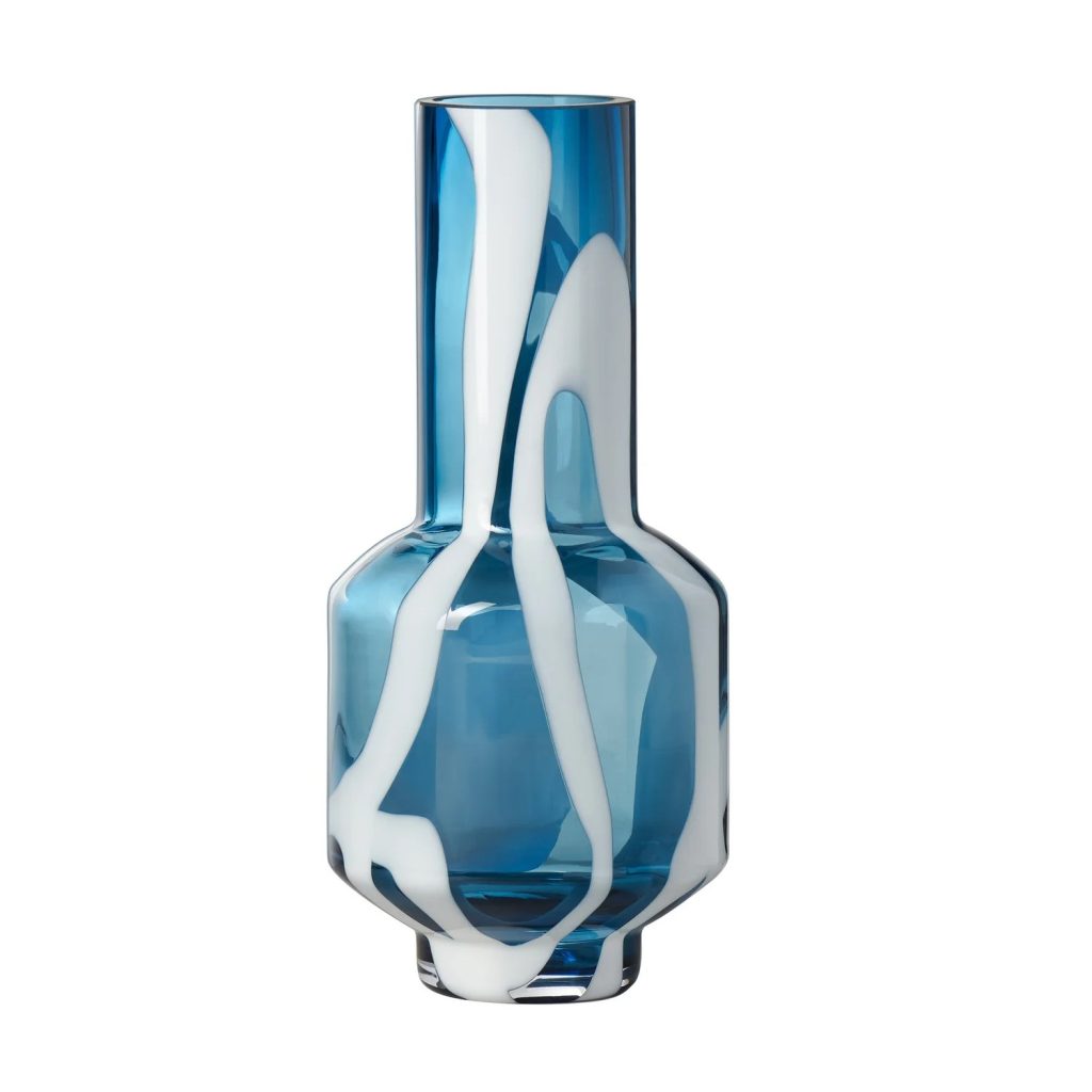 The Fusion Abstract Tall Vase is made of transparent blue glass with an opaque white swirled design. This vase's modern shape features a wider bottom half that tapers into a narrower neck and base. Elegant yet funky, the Fusion Abstract Vase is equally at home standing on its own or paired with your favorite flowers.