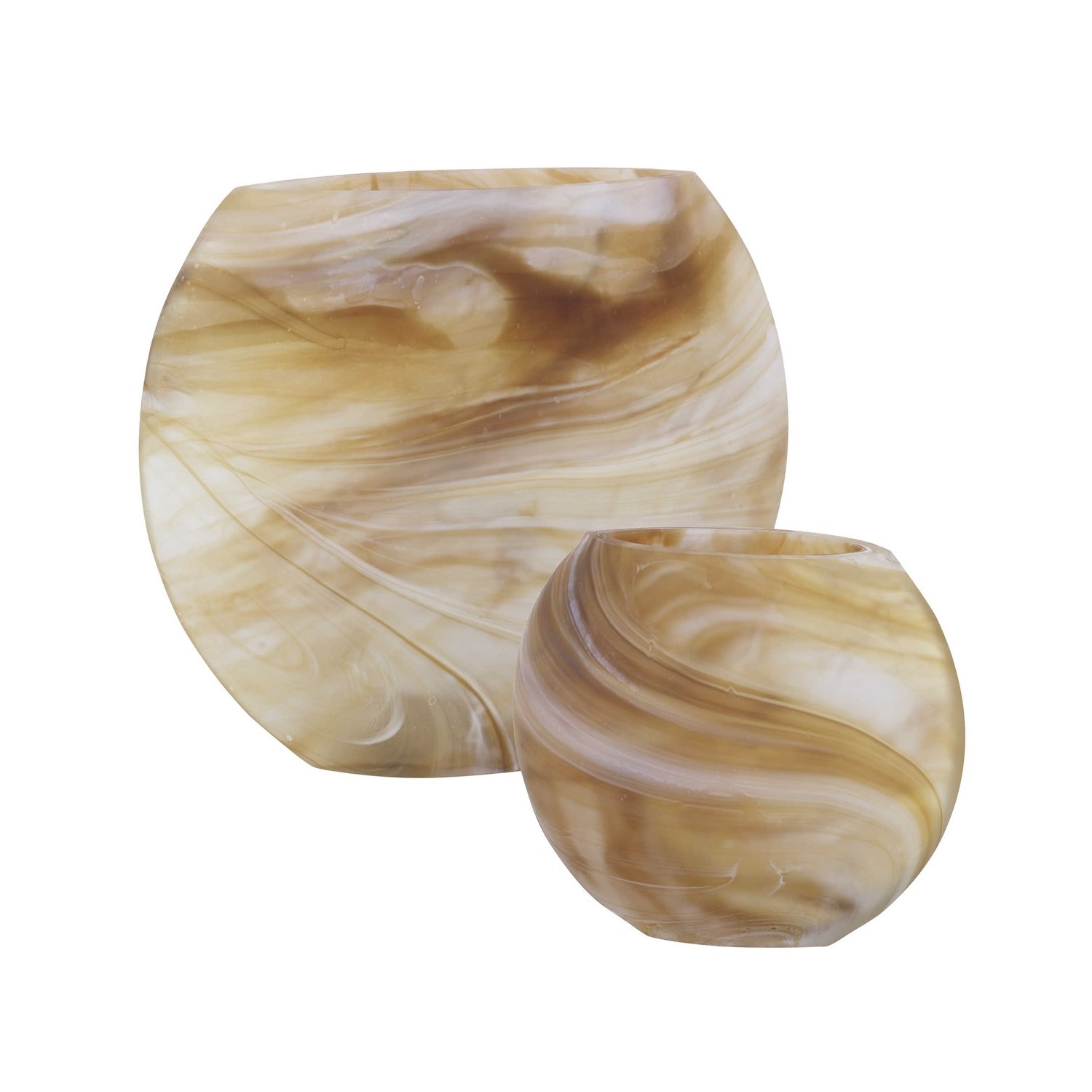 The Fusion Vases are crafted from glass and feature a swirled pattern in hues of caramel, ivory, and tan. Sold as a set of two, each vase has a round, flattened shape with a wide mouth ideal for holding your favorite flowers -- or display them on their own to add a warm and dynamic accent to any space.
