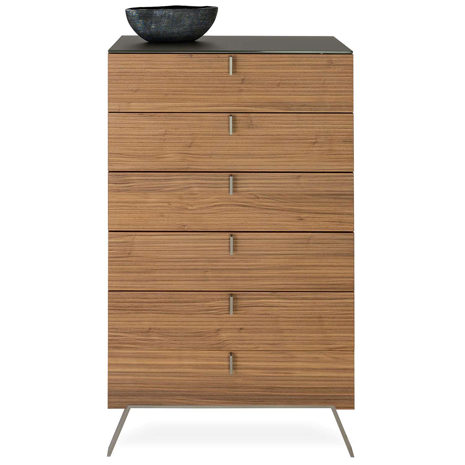 Beautifully crafted and refined, the Gala 6-Drawer High Chest has a 50s-inspired stylistic design with modern features. This chest features six grooved walnut veneer drawers with graphite lacquered interiors and a titanium-colored glass top -- a texture contrast that produces a soothing interplay between light and shadow. Titanium metal drawer pulls match the slim legs, which create a floating effect that enhances Gala's elegant look. Pair with the rest of the Gala bedroom collection for a charming yet nostalgic feel that delights all of the senses.