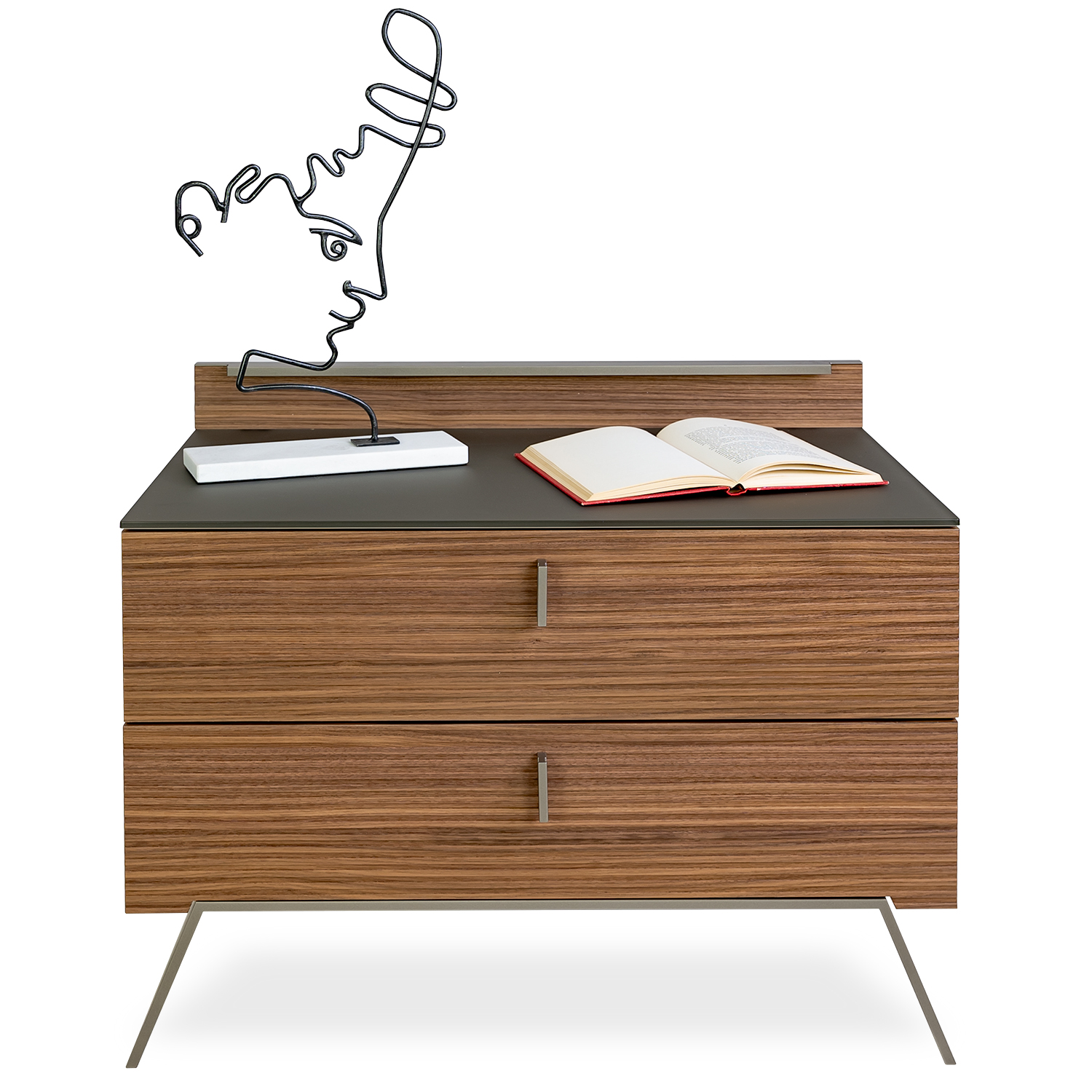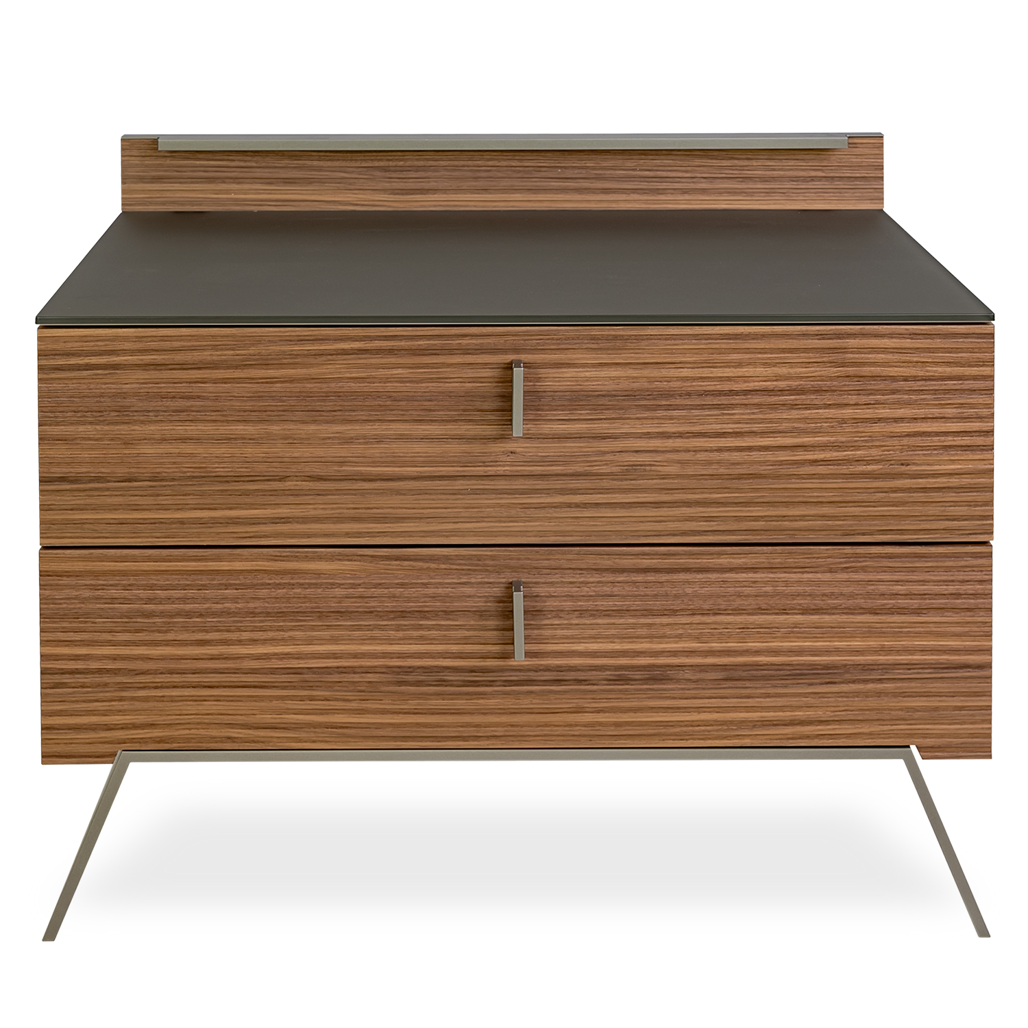 [0] => gala2 two (2) drawer night table in walnut with color glass, graphite lacquer and titanium legs and metal accents with light panel (for us 110volt current) included.