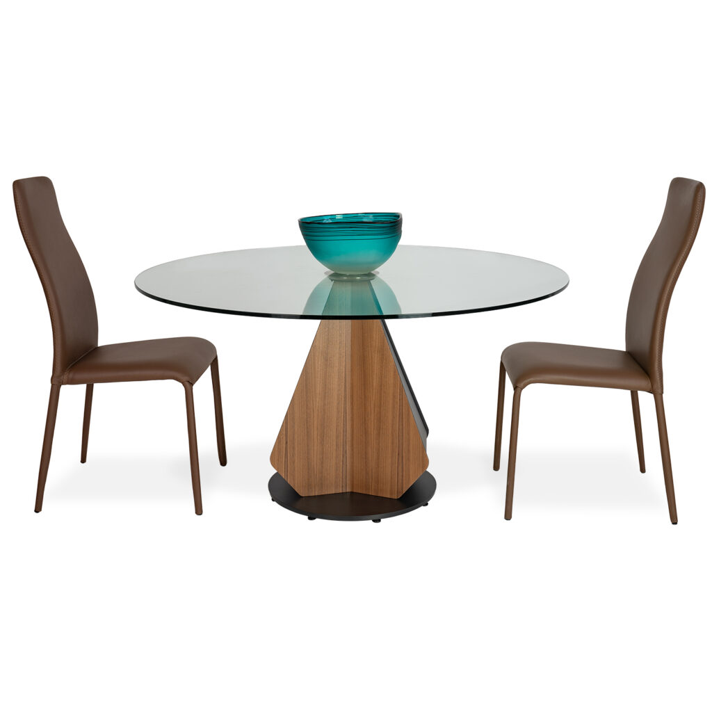 [0] => Inspired by the delicate folds of origami, the Gea dining table is elegant and contemporary, featuring a tempered clear glass top. Soft curves and smooth lines form the tapered base, made from natural walnut wood and carbon metal, which provides ample leg room for comfort. Perfect for intimate dinner parties, this table's graceful design proves that less is more.