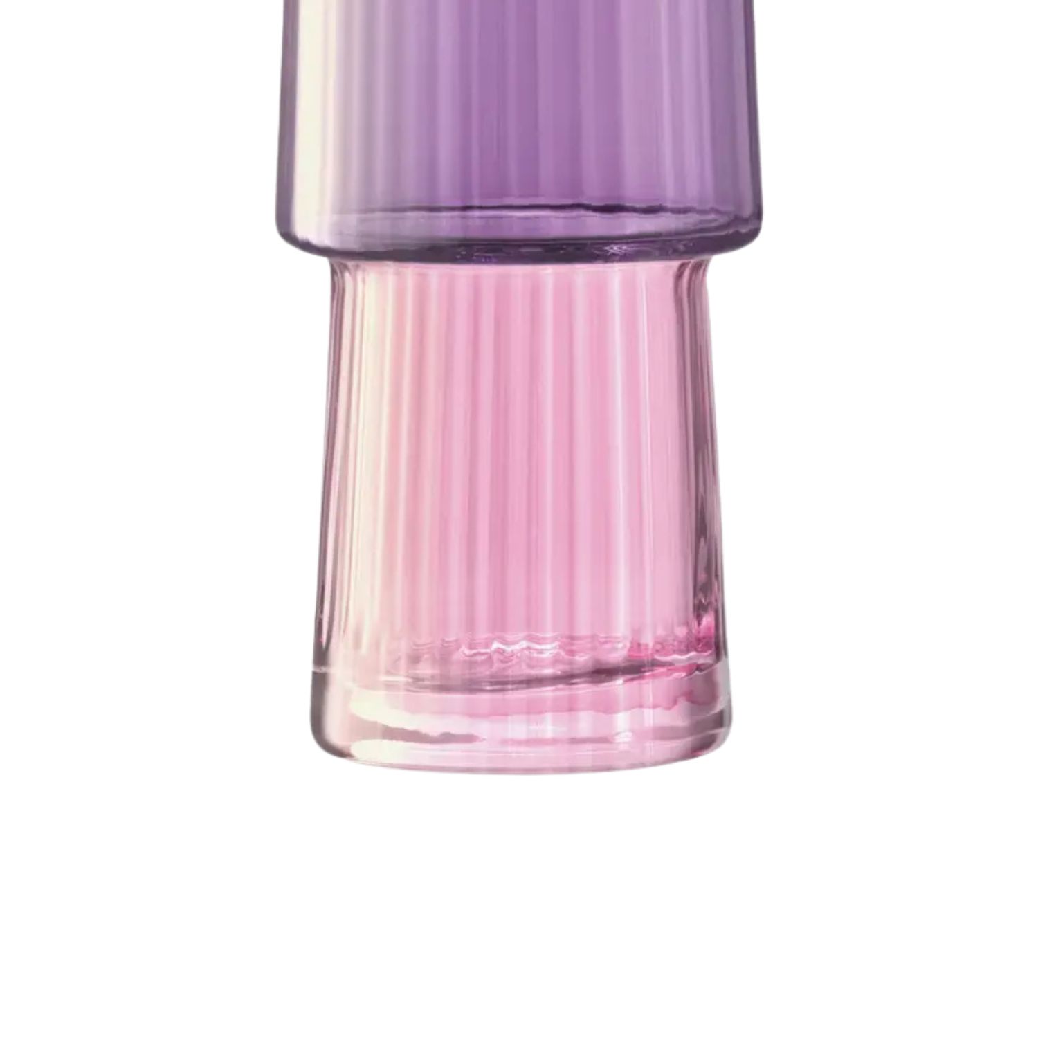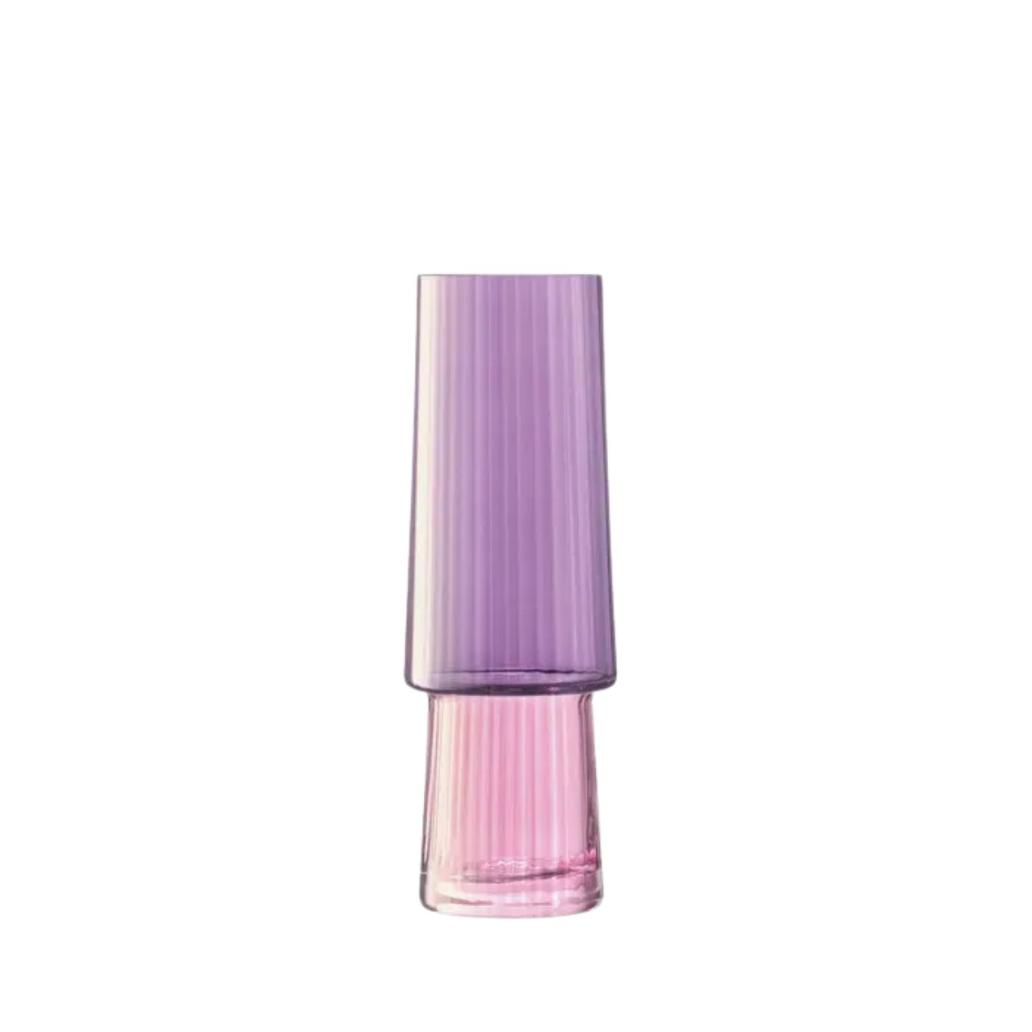 Inspired by the faceted look of polished garnet, the Gem Vase is hand-painted with two iridescent lusters in purple and pink. A subtle fluted texture results in the eye-catching play of light on the vase's surface. Gem is made of mouth-blown glass with a stacked and lightly tapered form that makes it a striking vessel for your favorite bouquet.