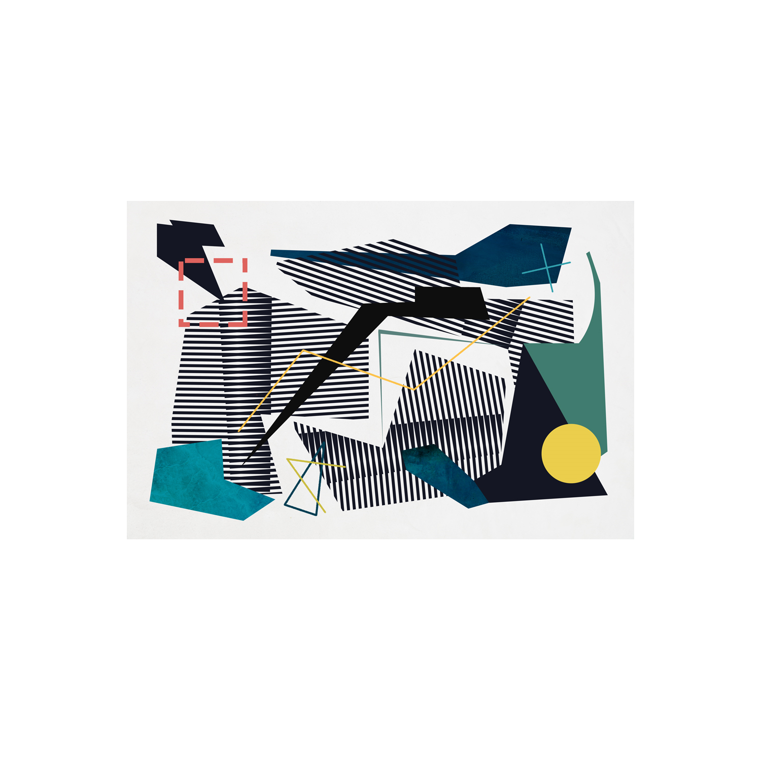 [0] => The Geometric Wall Art uses angular shapes and funky patterning to create a mod focal point for your living room or office. Reminiscent of the Memphis design style of the '80s, this work is full of jagged lines, asymmetric shapes, and a bold striped pattern that instantly grabs the eye. The monochrome black and white shades are offset by accents of red, yellow, green, and blue, and finished with a glossy surface.