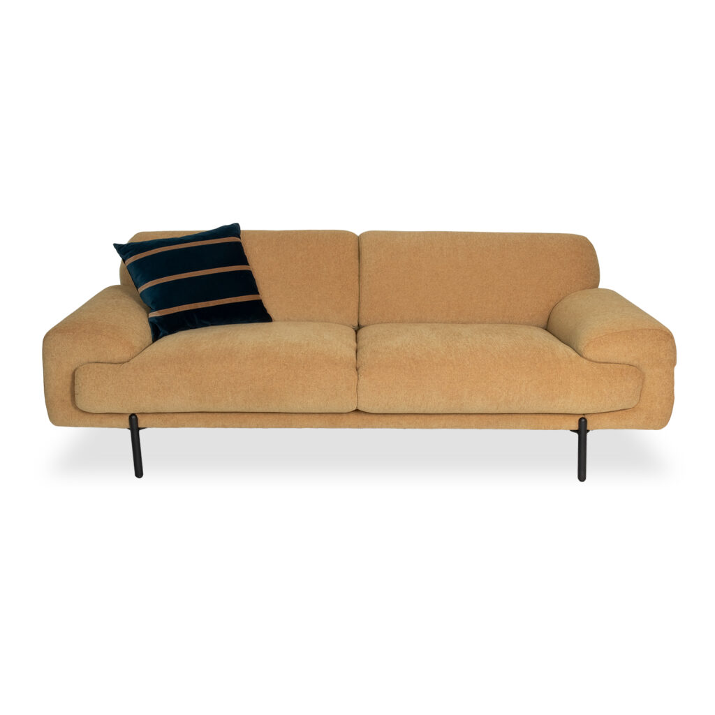 [0] => Bring a cheerful, glam impression to your living space with the Georgie Sofa. This sofa is upholstered in easy-clean polyester fabric in an eye-catching marigold yellow. The inner coil seat cushions have no-sag spring support, while the armrests curve over onto the cushions for a cozy look. Wide seats can accommodate up to 4 sitters for movie nights or get-togethers. Slim black metal legs finish off this sofa for a profile that blends retro and contemporary.