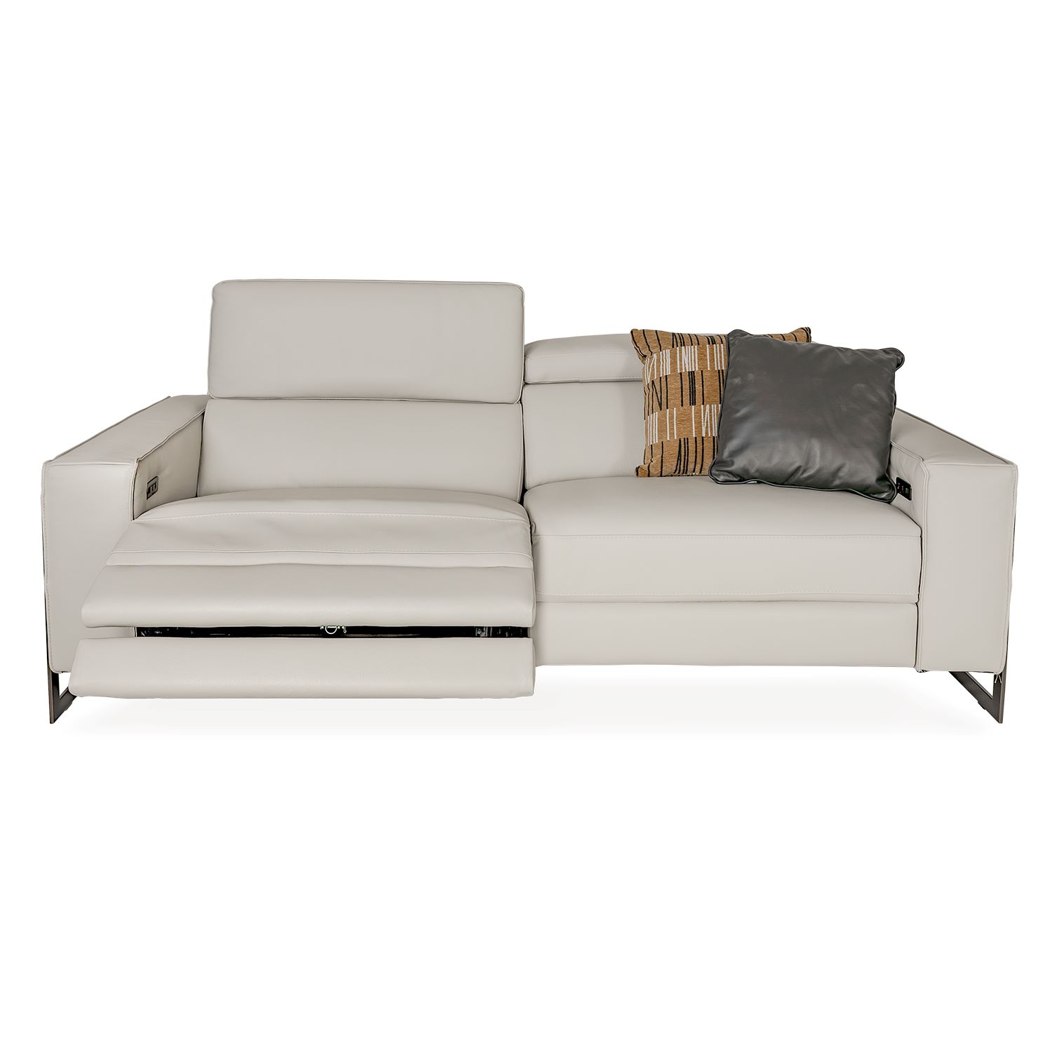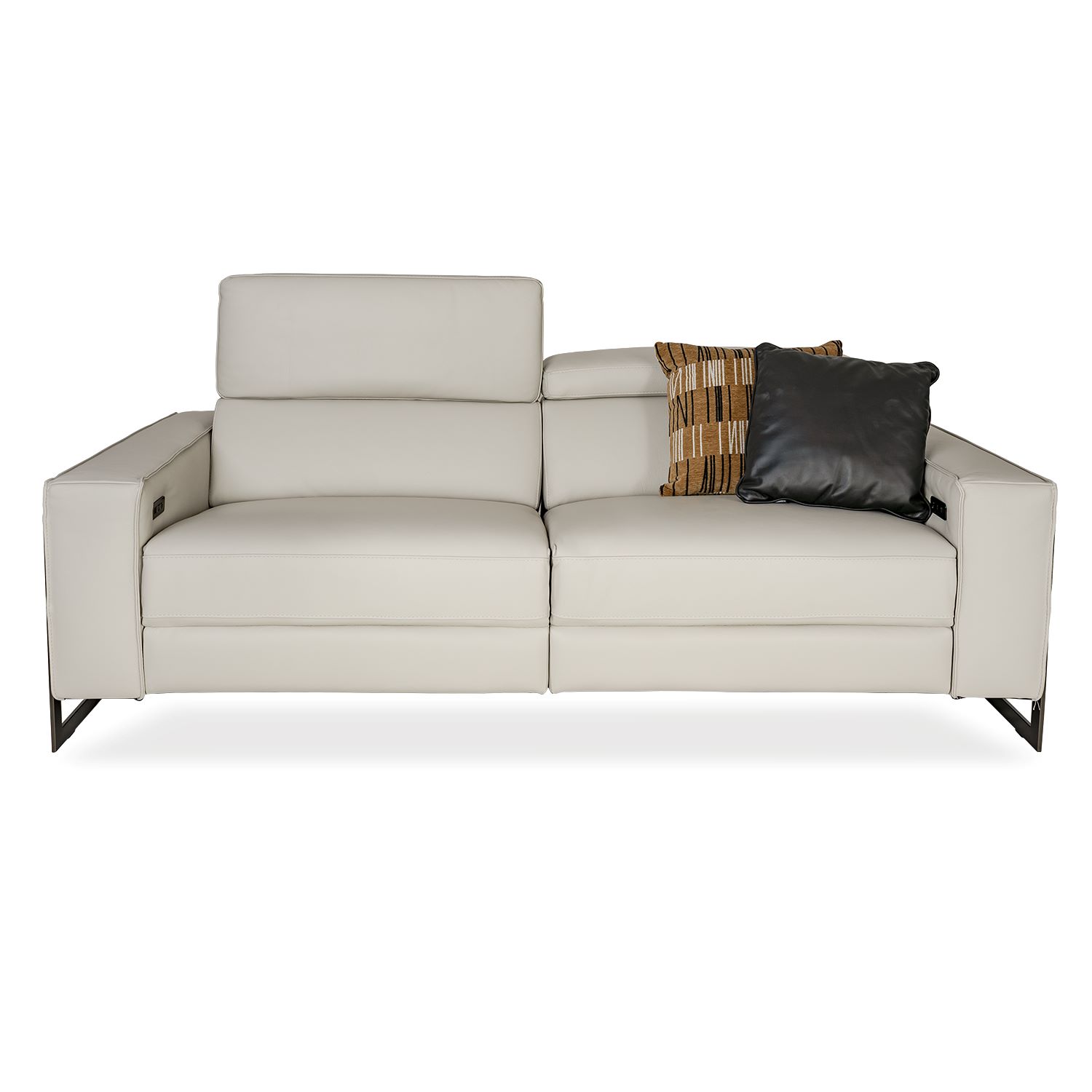 The Giana Sofa can do it all, with two power motion recliner seats that can be easily accessed via discreet buttons on the inside of each arm. Giana has a crisp geometric design with a gentle curve to its back and seat cushions. The cream Giotto leather complements the satin metal legs, which echo the sharp angles of the sofa, creating a unified look that's softened by light tufted stitching on the sides.