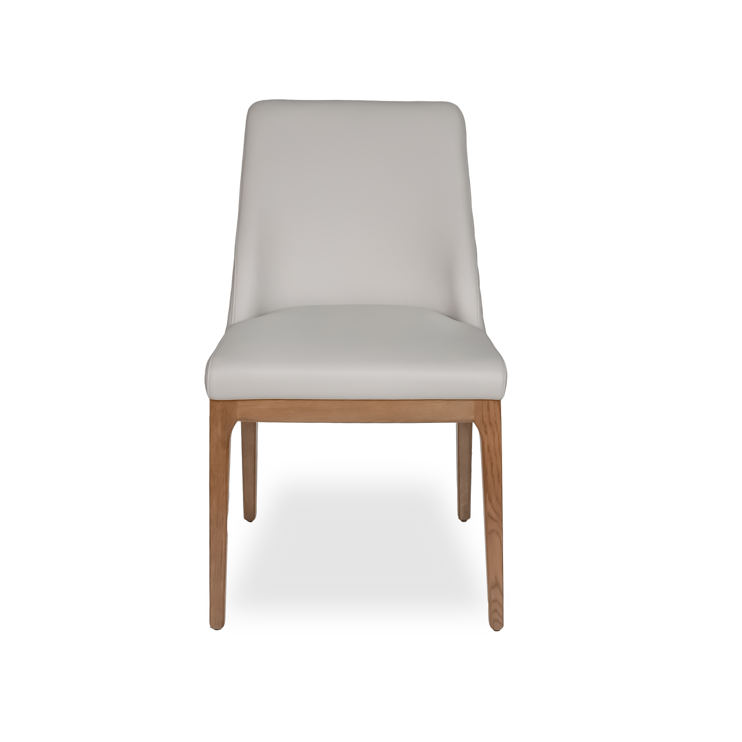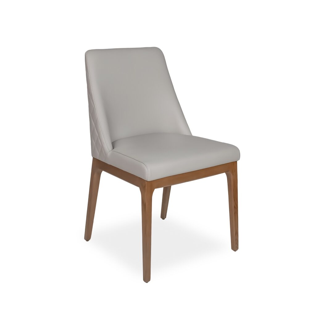[0] => The Gigi Dining Chair features a comfortable, structured design with tasteful stitching and details. Gigi has a curved, shell-shaped back accented by diamond quilted stitching, and tapered walnut-stained oak legs. The seat and back are upholstered in soft light grey leather, with the walnut frame adding a warm-toned hue.