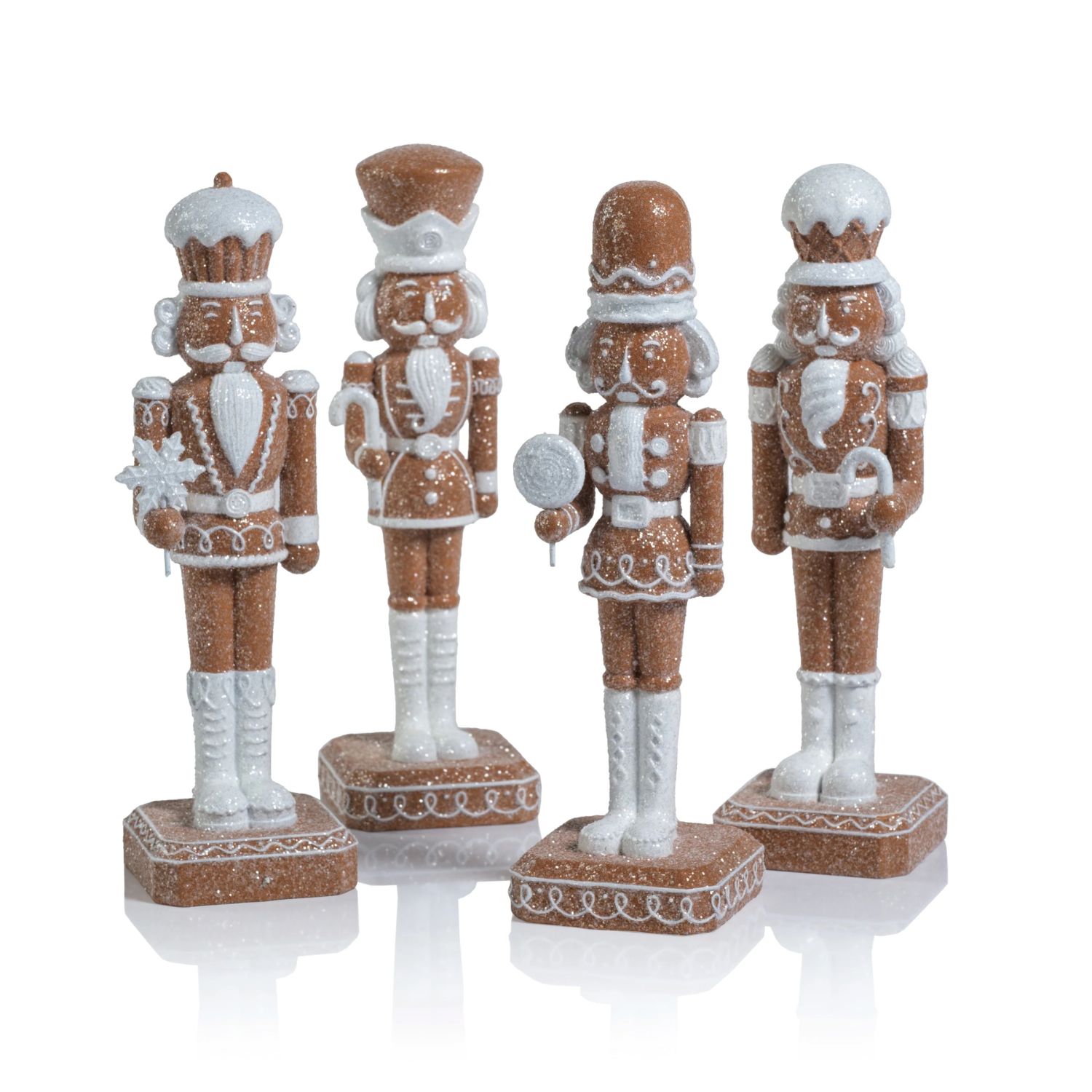 Spice up your holiday aesthetic with the Gingerbread Soldier, featuring a white and brown resin finish sprinkled in glitter for a festive sparkle. This soldier holds a candy cane in his left hand and wears a fun ice cream hat on his head. Pair with the companion Gingerbread Soldiers to make a cheerful holiday quartet.