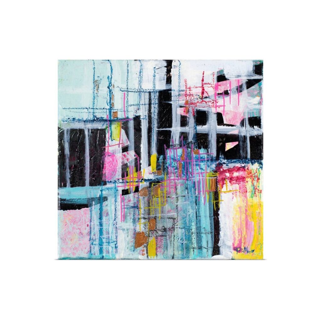 [0] => The Gio Grid I Wall Art, by Robin Maria, calls to mind the style of Jean-Michel Basquiat with a canvas full of unabashed color and layered visual textures. Blue, pink, yellow, and white meet in a frenzy of brushstrokes and cross-hatched lines over a black background. A glossy surface adds shine to this gritty, yet exuberant, piece.