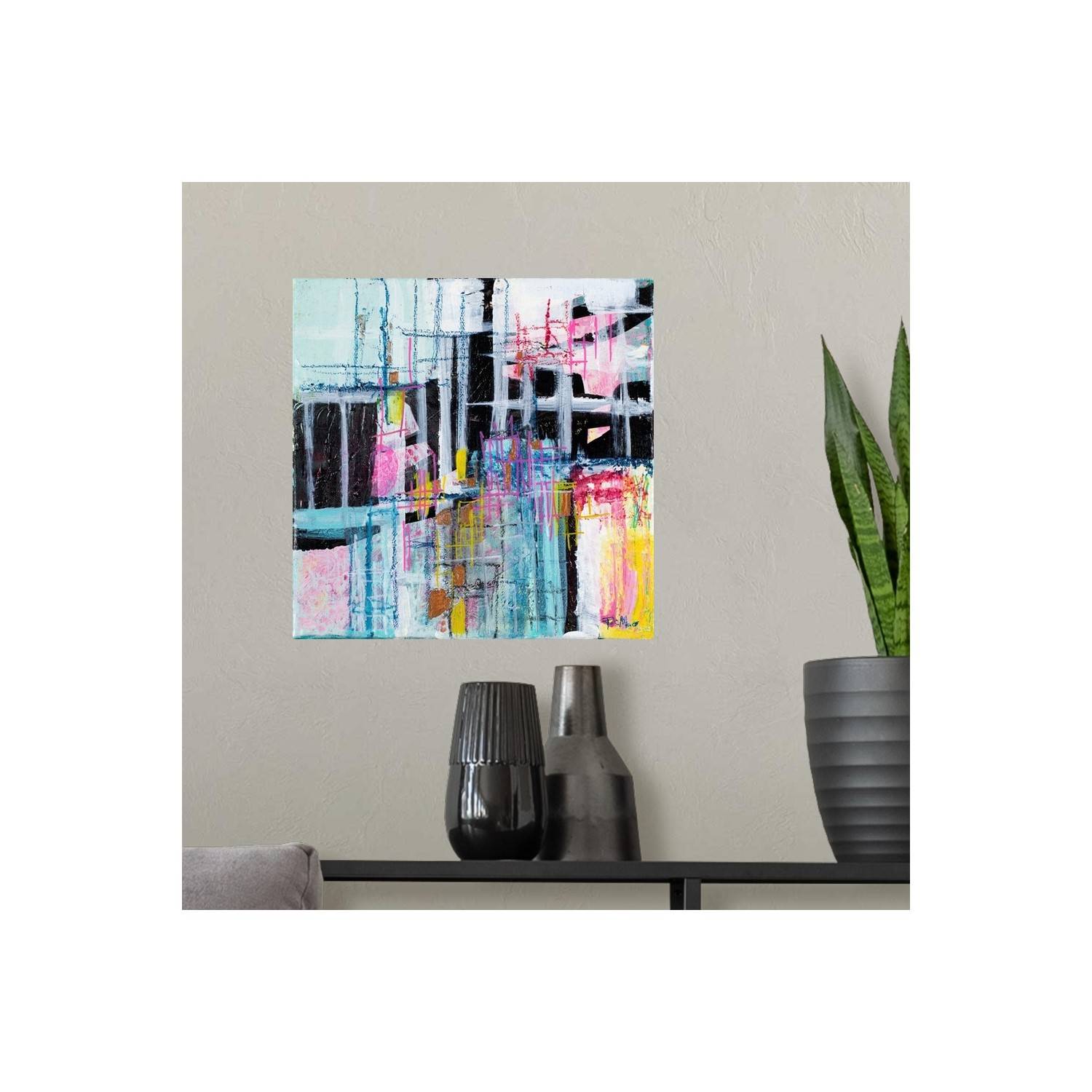 The Gio Grid I Wall Art, by Robin Maria, calls to mind the style of Jean-Michel Basquiat with a canvas full of unabashed color and layered visual textures. Blue, pink, yellow, and white meet in a frenzy of brushstrokes and cross-hatched lines over a black background. A glossy surface adds shine to this gritty, yet exuberant, piece.