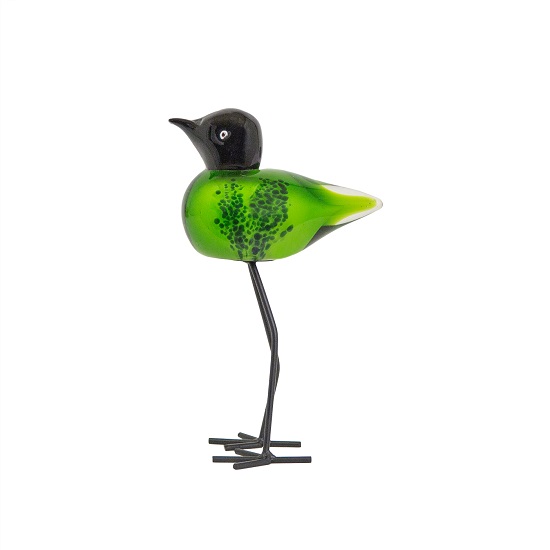 [0] => This Glass Bird features a kelly green body and black head, with black metal legs. Minimalist and delicate, this bird is a cheerful accent to any living space, and has subtle variations in color that appear natural within the glass.