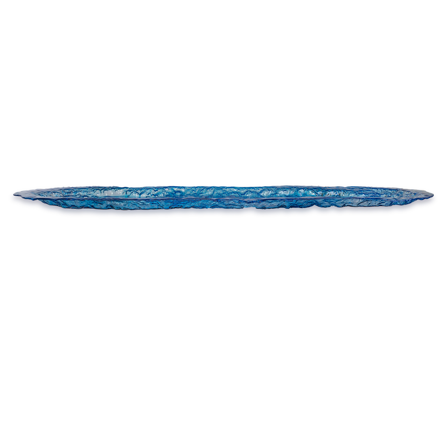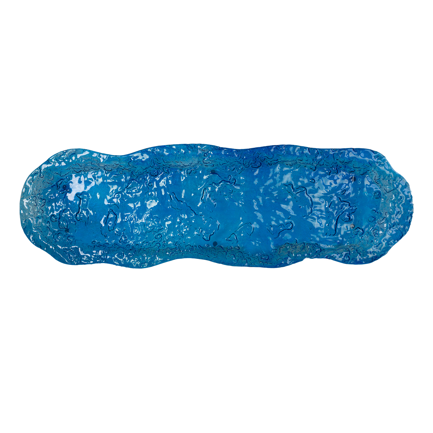The Glass Tray features an organic shape and dynamically textured surface whose vibrant blue coloring evokes the look of water and marine life. With an expansive size that instantly catches the eye, this tray is suitable for displaying large arrangements of fruits, foliage, and art objects -- or simply standing on its own to make a dramatic statement.