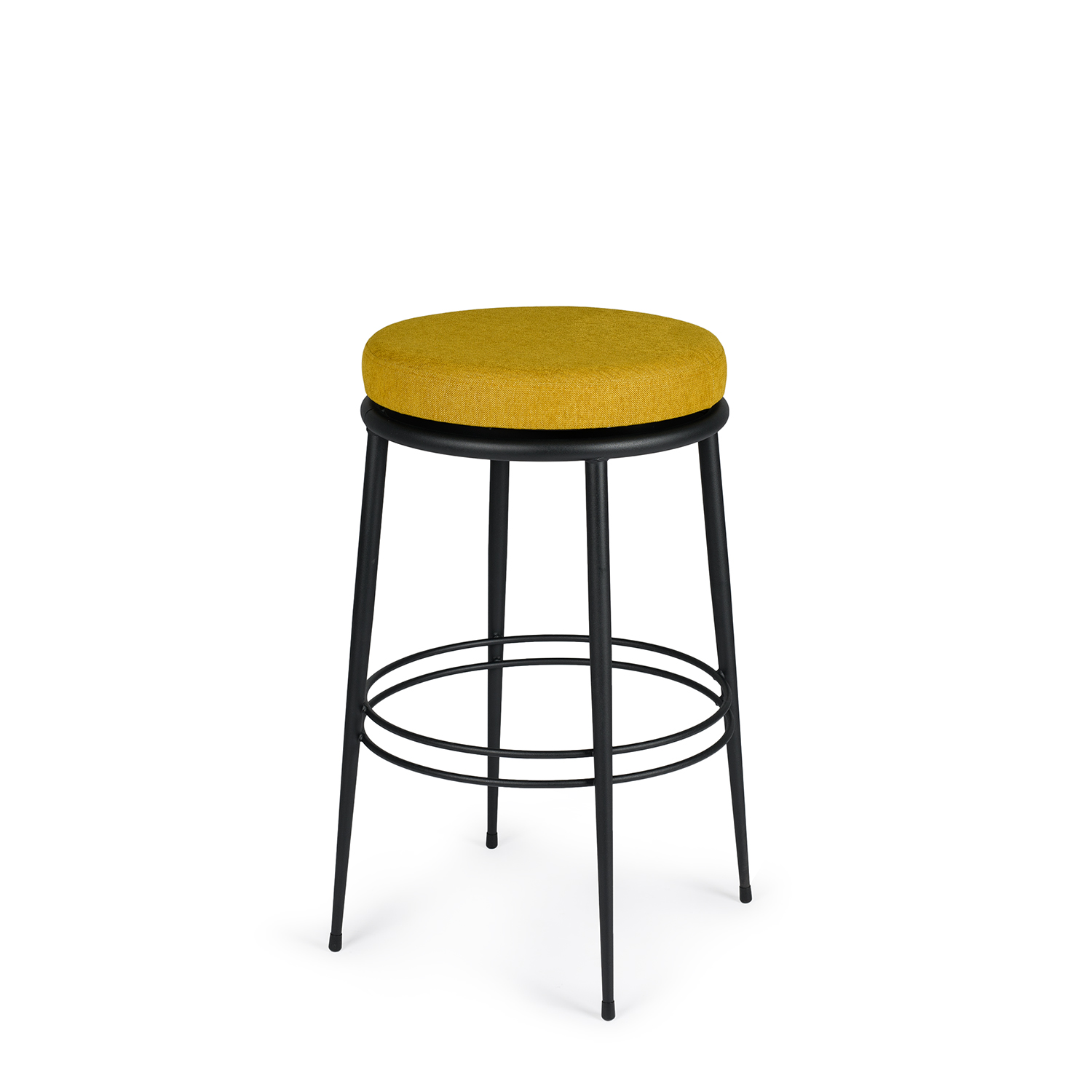 [0] => The Glen Barstool features a black coral metal frame with a slightly grainy texture and matte finish, as well as textured mustard fabric upholstery made of soft chenille fibers. Minimalist and sleek, this stool combines classic design with contemporary elements, and fits into any design environment with it's edgy color contrast.