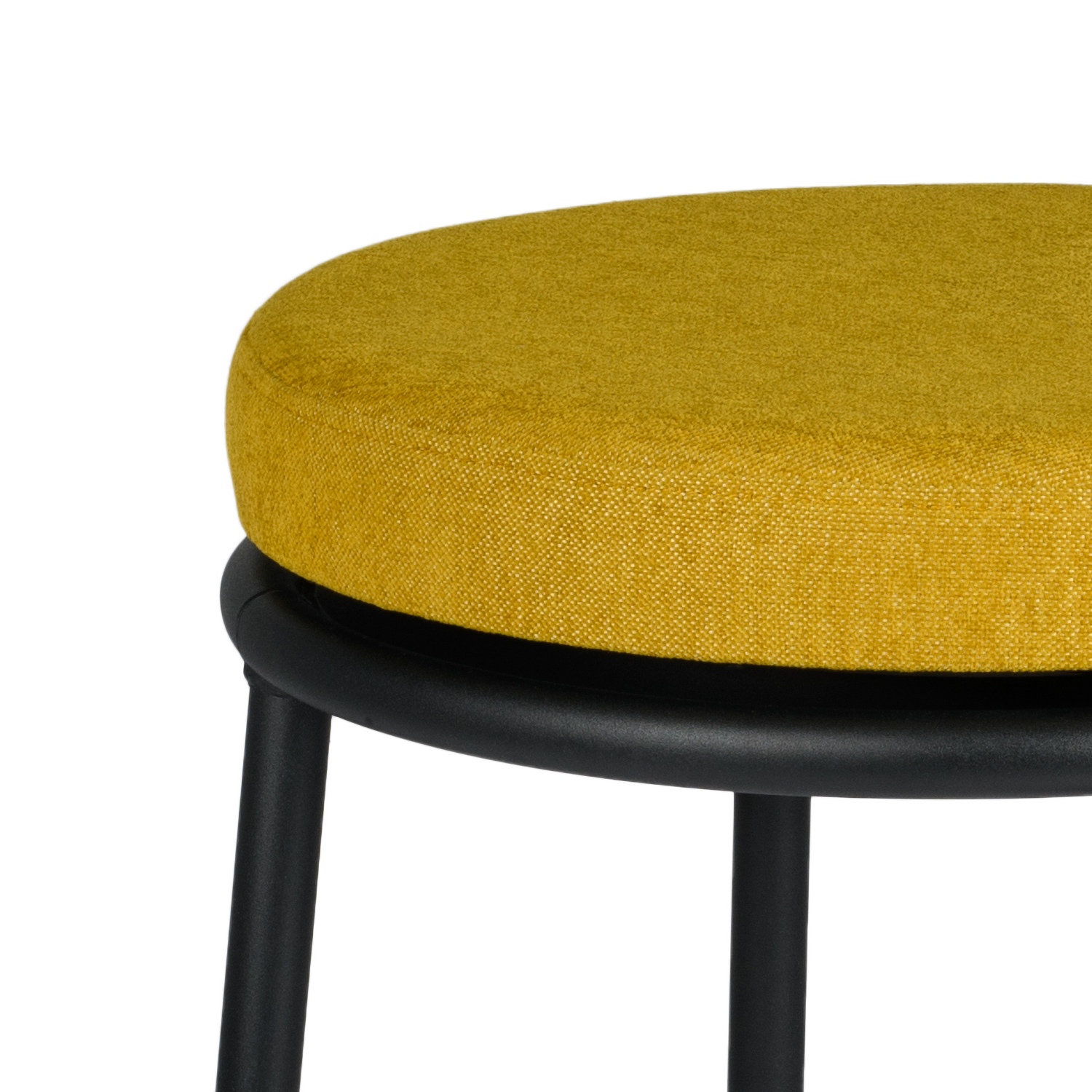 The Glen Barstool features a black coral metal frame with a slightly grainy texture and matte finish, as well as textured mustard fabric upholstery made of soft chenille fibers. Minimalist and sleek, this stool combines classic design with contemporary elements, and fits into any design environment with it's edgy color contrast.