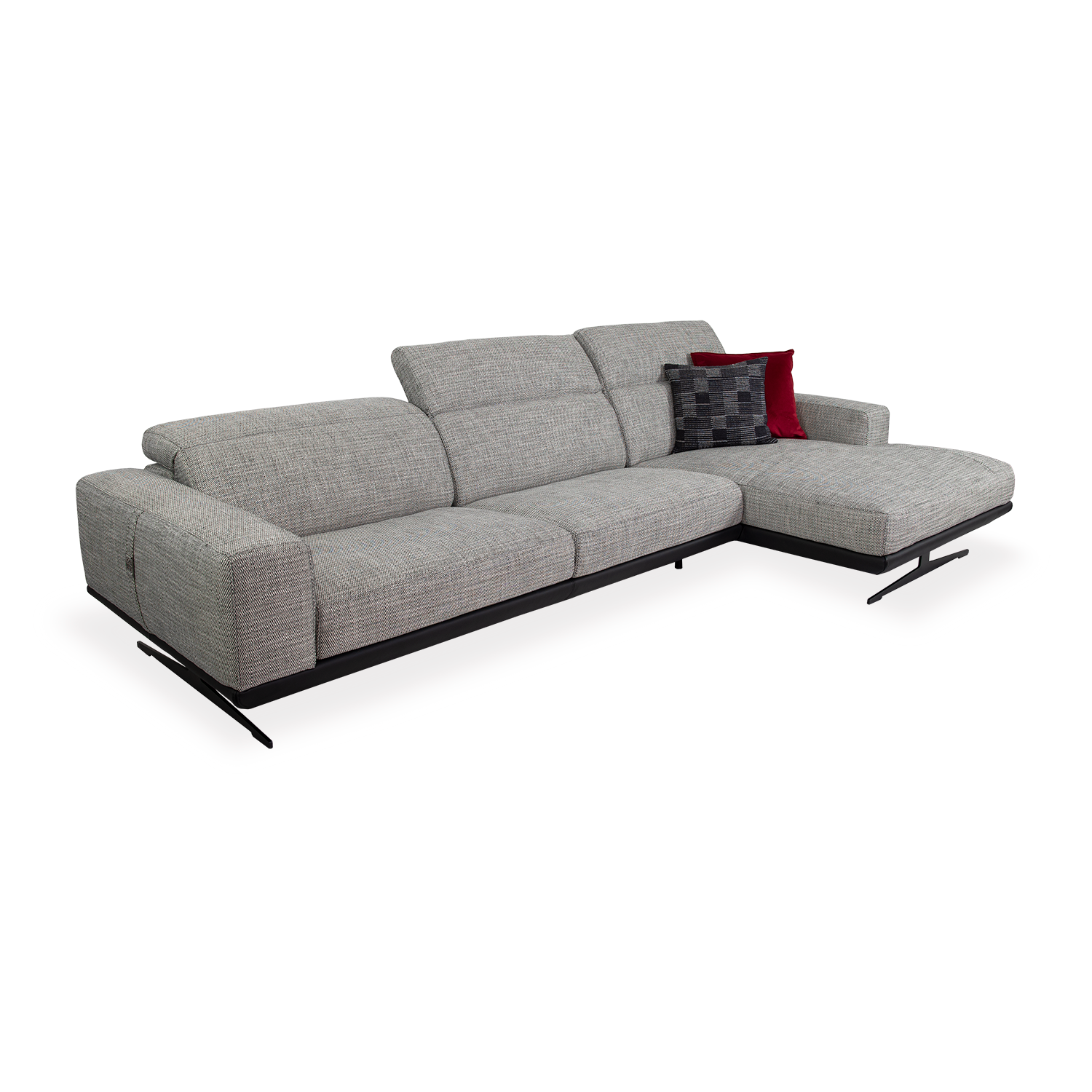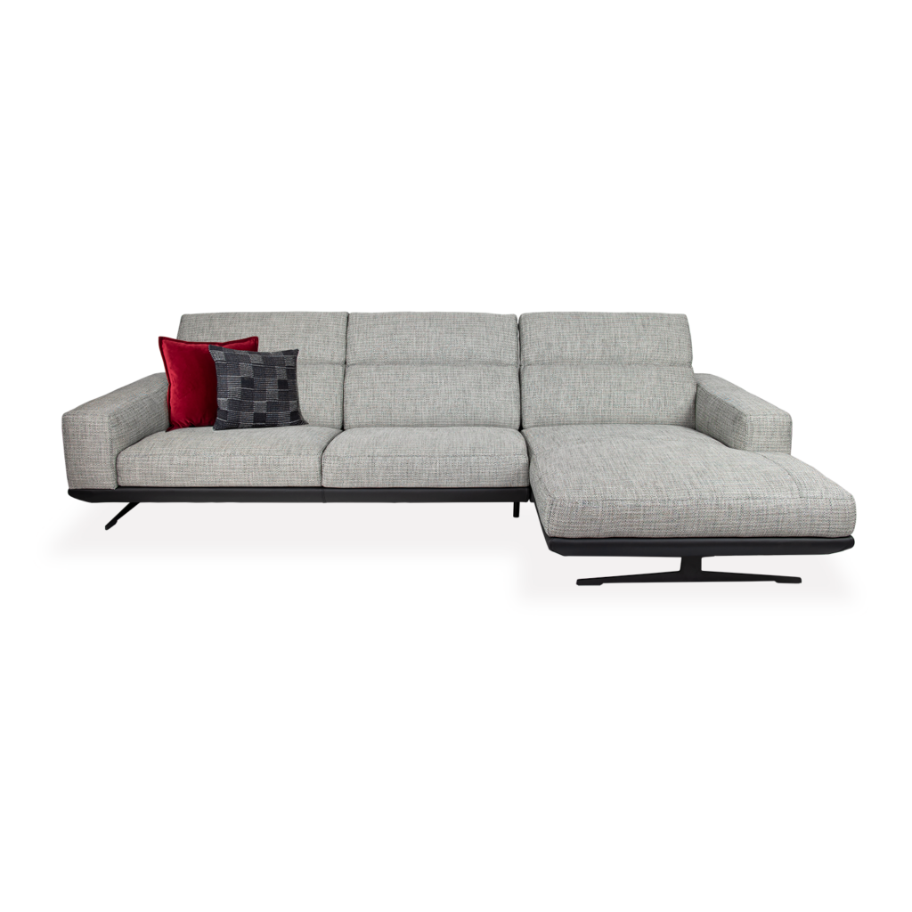 [0] => The Gloria Sectional is made in Italy and features a mid-century modern inspired design, with a low profile and minimalist style. The grey fabric upholstery has variegated tones of white and black for a textured look, while the black leather base and slim black legs enhance the sleek silhouette. Gloria's wide chaise, seats, and armrests add to the retro feel, and the headrests are manually adjustable, so that you can sink in and choose your preferred level of comfort.
