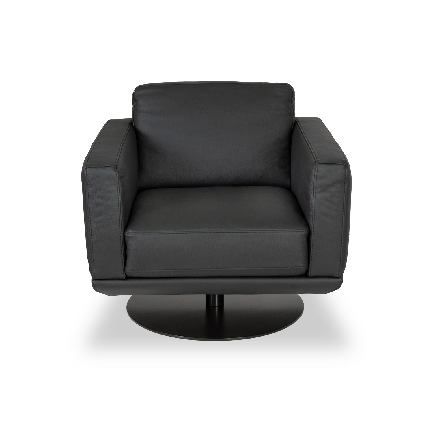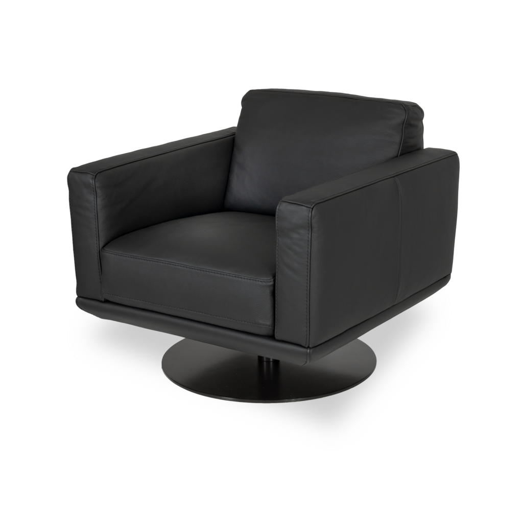[0] => The Gloria Swivel Chair is made in Italy and inspired by the designs of the 1950s. Black leather and a matte black swivel base give this chair a sleek look, while the wide seat and high arms make for an inviting silhouette. The round shape of the base contrasts with the angular lines of the body for a retro feel.