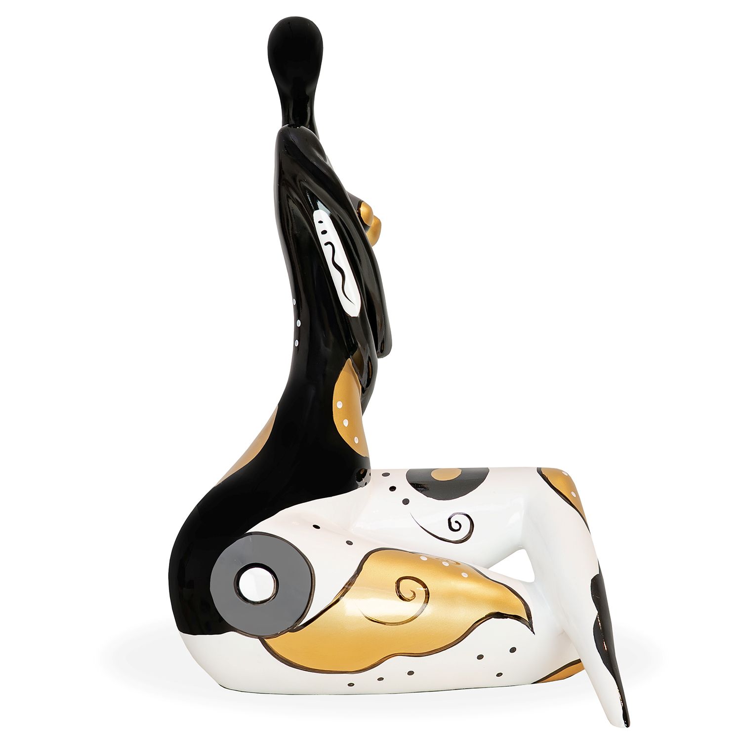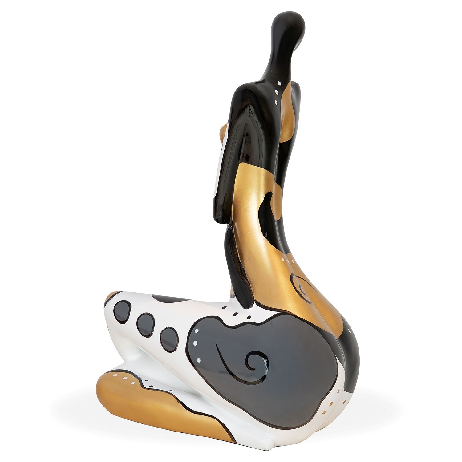 [0] => The Gold Queen Sculpture, made of polyresin with a glossy finish, depicts a woman sitting with her legs crossed, head tilted, and one arm cradling the other. Her body is painted in black, white, and gold, with dots, swirls, and organic shapes livening up the surface. Place Gold Queen on any display surface to add a graceful, yet whimsical, accent to your interior.