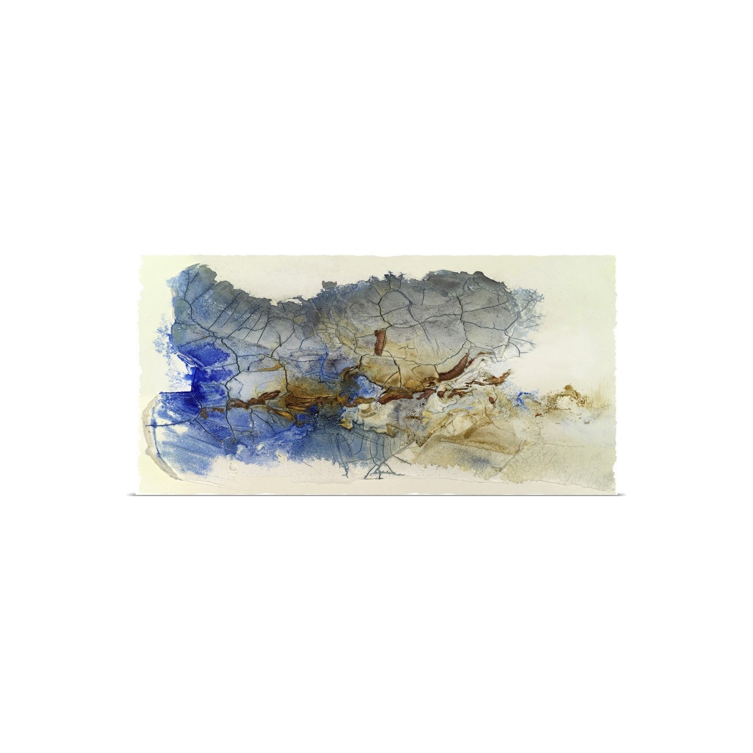 [0] => Golden I, by Sheila Finch, is an abstract wall art that evokes the textures of natural landscapes. Bright tones of blue at the left of the canvas contrast with shades of brown, grey, and beige, overlaid with cracks reminiscent of dry terrain. With its large size and glossy finish, Golden I will bring the raw beauty of the earth into your home.
