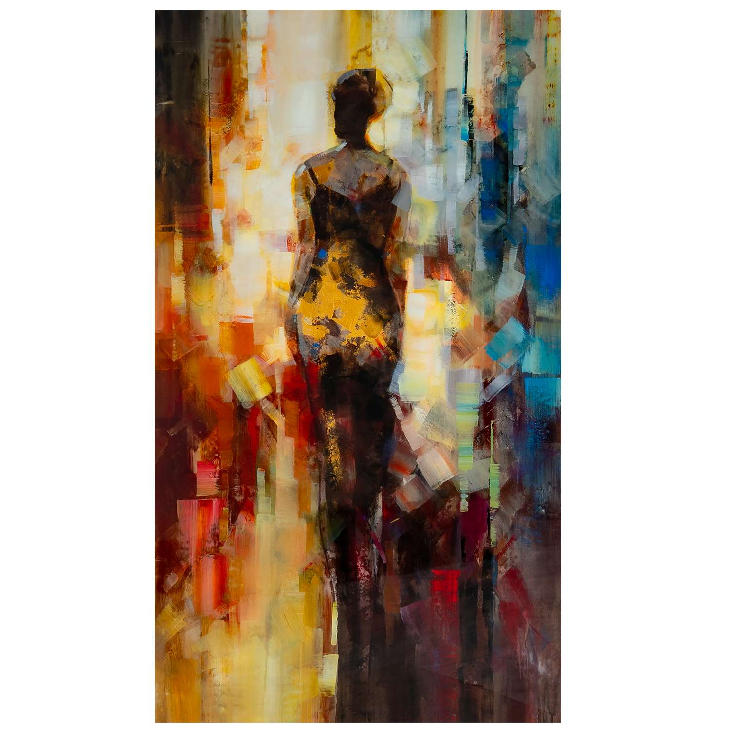 [0] => Golden Lights II, by Eric Jarvis, is a semi-abstract wall art that depicts the profile of a figure turned away. Layers of bold brushstrokes form a blurred background that could be a busy street or lit ballroom, with a mixture of warm and cool tones highlighting the figure's path forward. This artwork's dynamic depth is further heightened by its glossy finish.