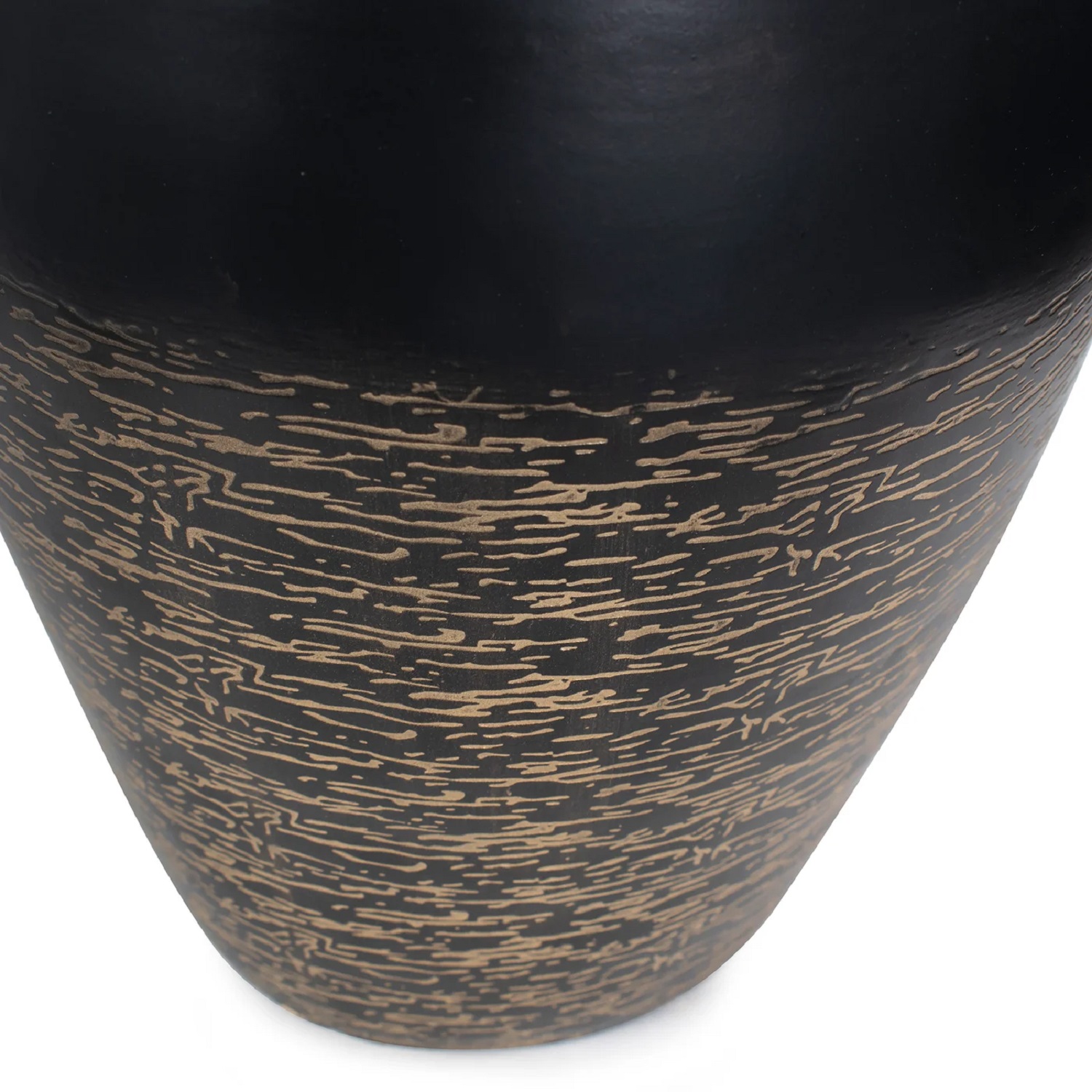 [0] => The Golden Thread Vase features a pattern of etched golden lines on its lower half that gives it a subtly opulent feel. Crafted from iron, this vase has a matte black finish and a simple, elongated form that tapers lightly at the mouth and base. Pair with the matching Golden Thread Vessel for a sophisticated display.