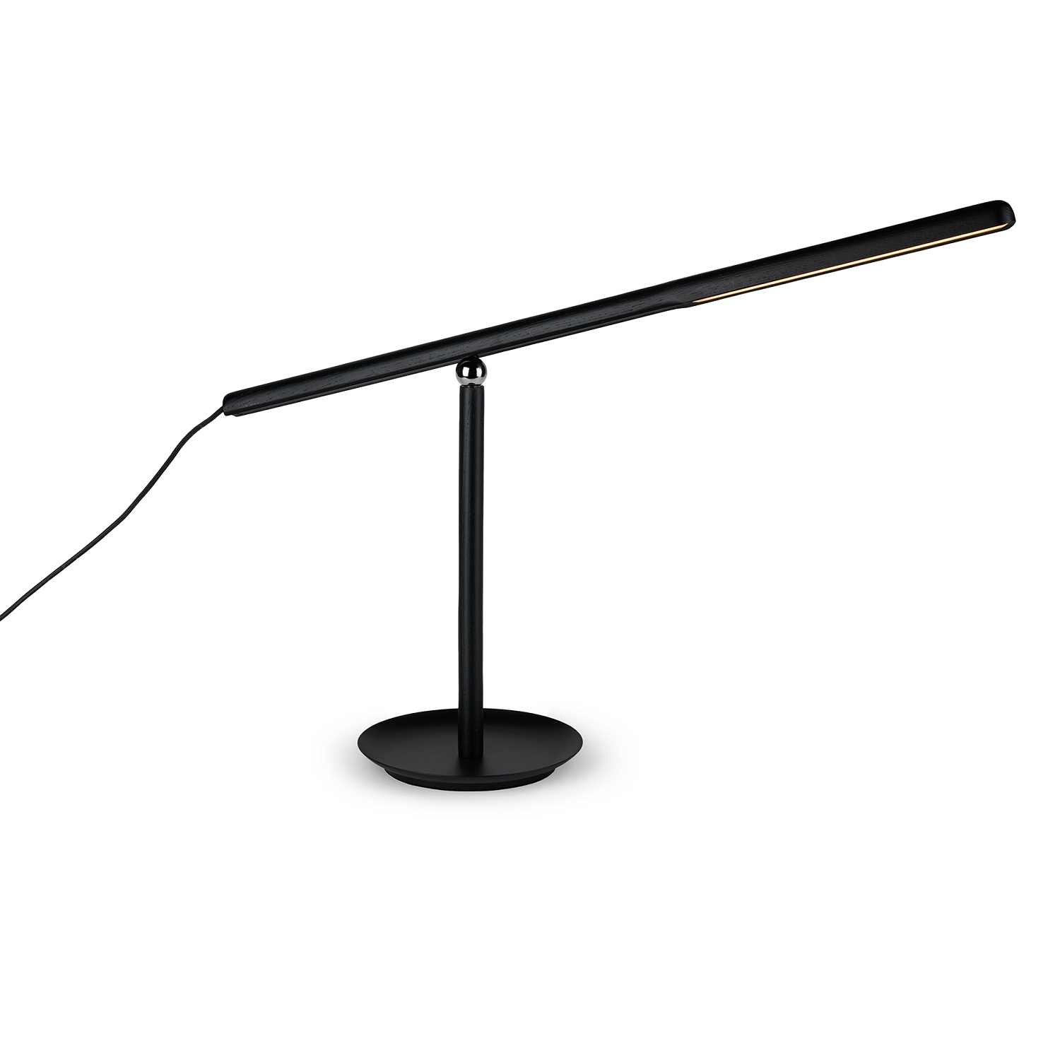 [0] => The Gravity Desk Lamp, available in black, is versatile and easy to adjust, with a 360-degree range of movement that operates smoothly due to a small metal ball connection. This lamp has a sleek design and a circular base that curves upwards slightly to provide stability. Gravity's LEDs have a color temperature of 3,000K and the level of light can be adjusted with the touch dimmer switch. Gravity has a 106" black fabric covered cord.