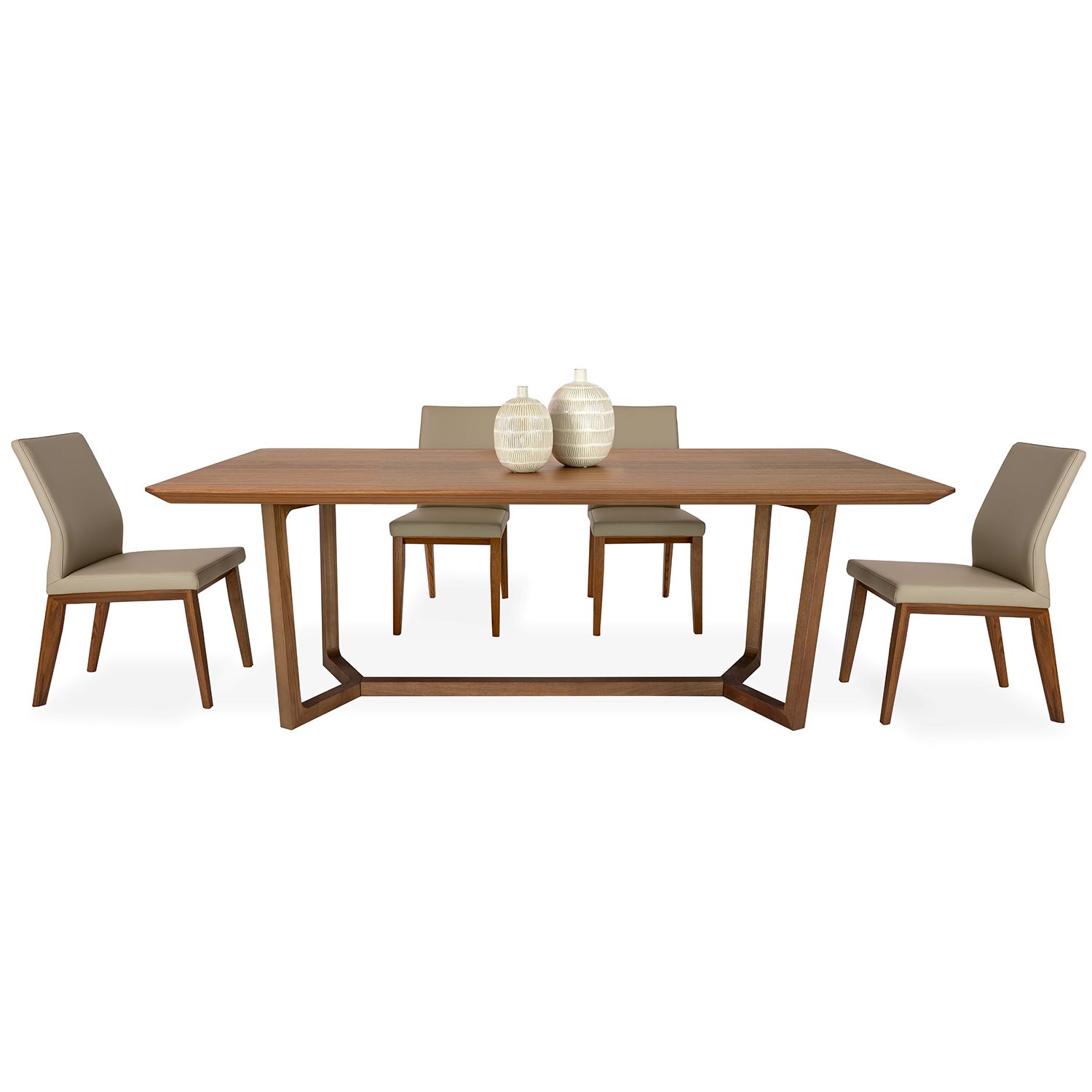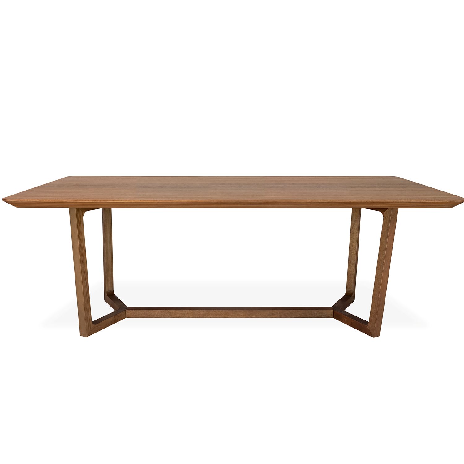 Part of Copenhagen's Essentials collection, the Grayson Dining Table combines a timeless look with a modern twist. Available with a walnut finish, Grayson has a beveled rectangular tabletop supported by legs that taper to two triangular points connected by a central beam for extra stability. This table's clean silhouette and distinctive design makes it ideal for both traditional and modern dining rooms. Seats 6-8.