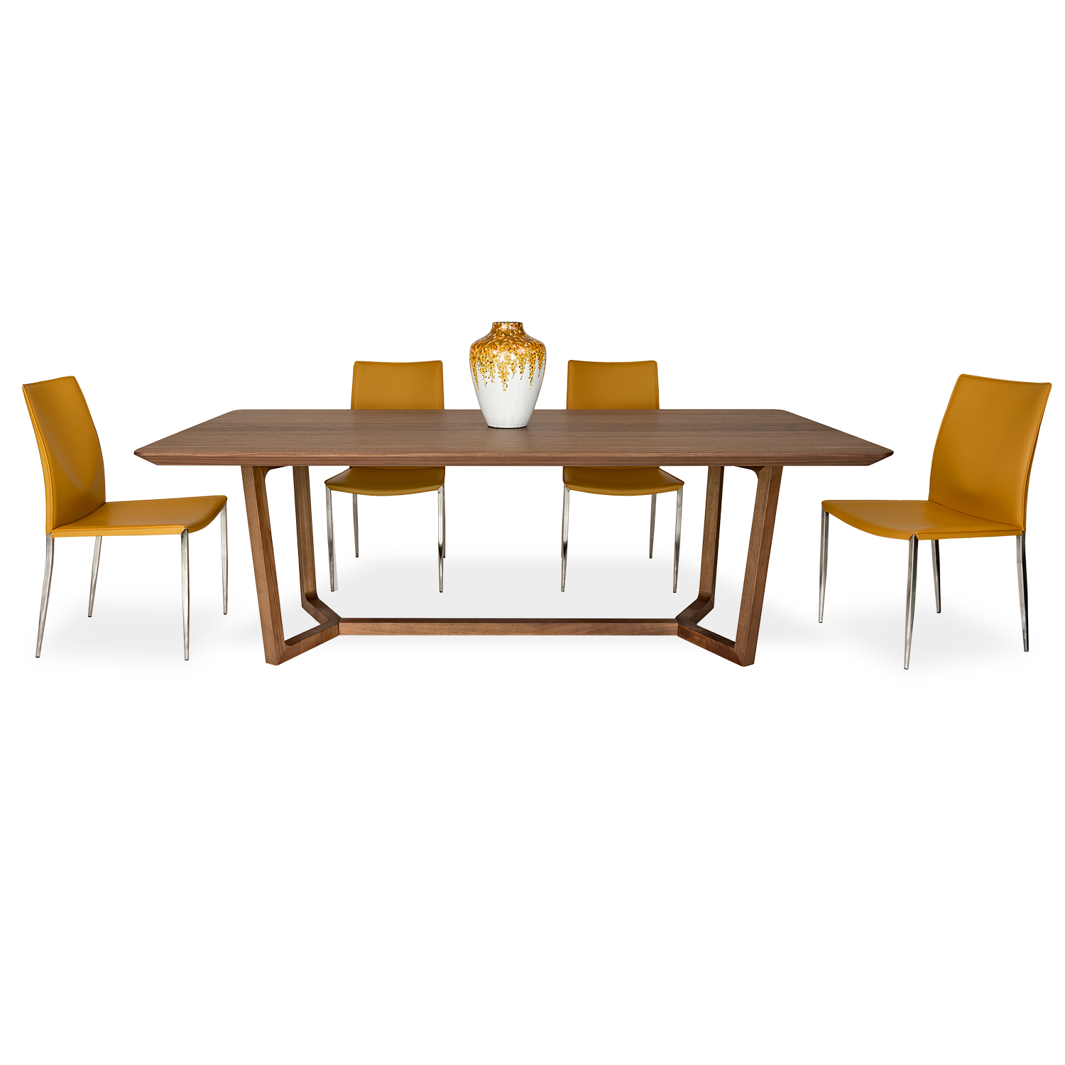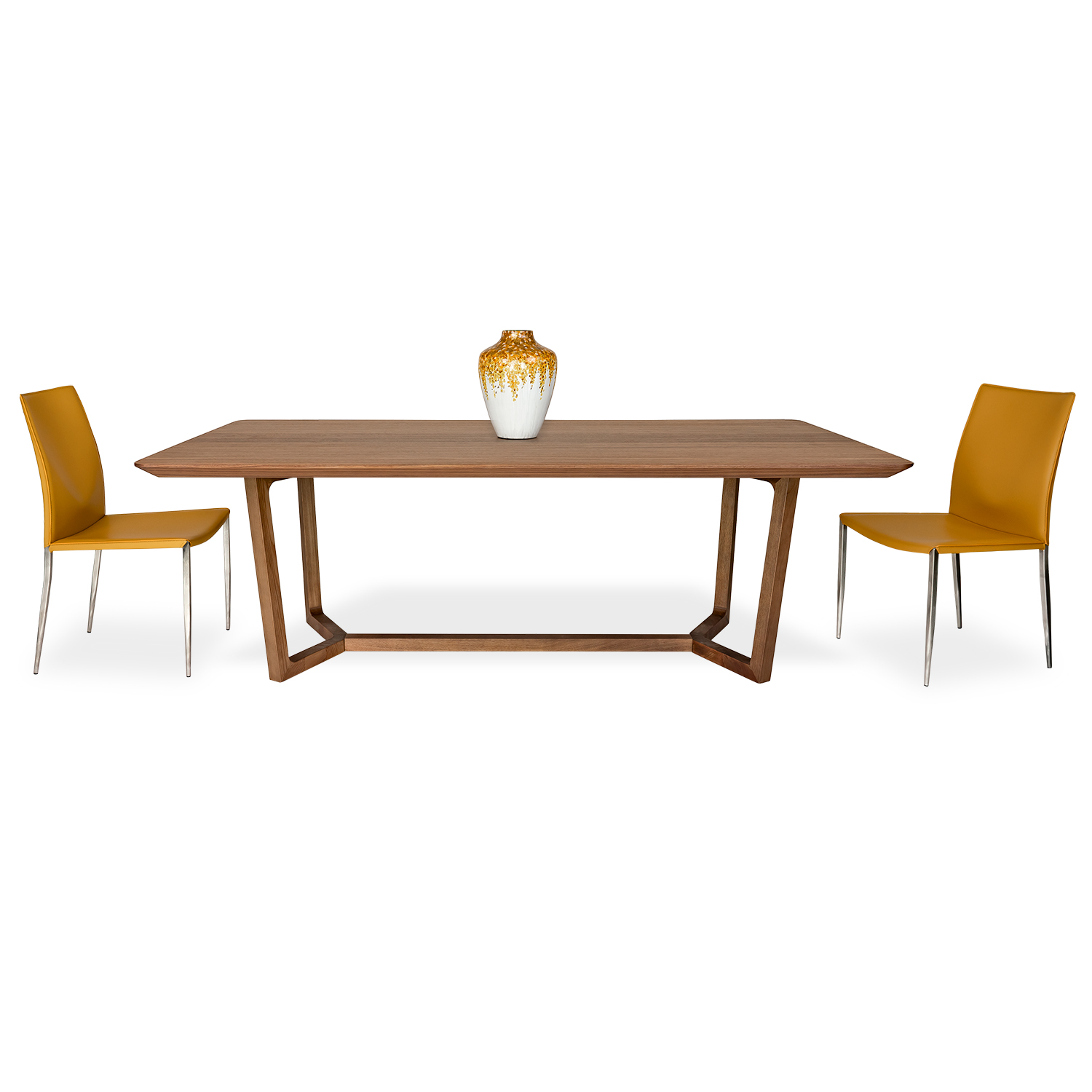 Part of Copenhagen's Essentials collection, the Grayson Dining Table combines a timeless look with a modern twist. Available with a walnut finish, Grayson has a beveled rectangular tabletop supported by legs that taper to two triangular points connected by a central beam for extra stability. This table's clean silhouette and distinctive design makes it ideal for both traditional and modern dining rooms. Seats 8-10.